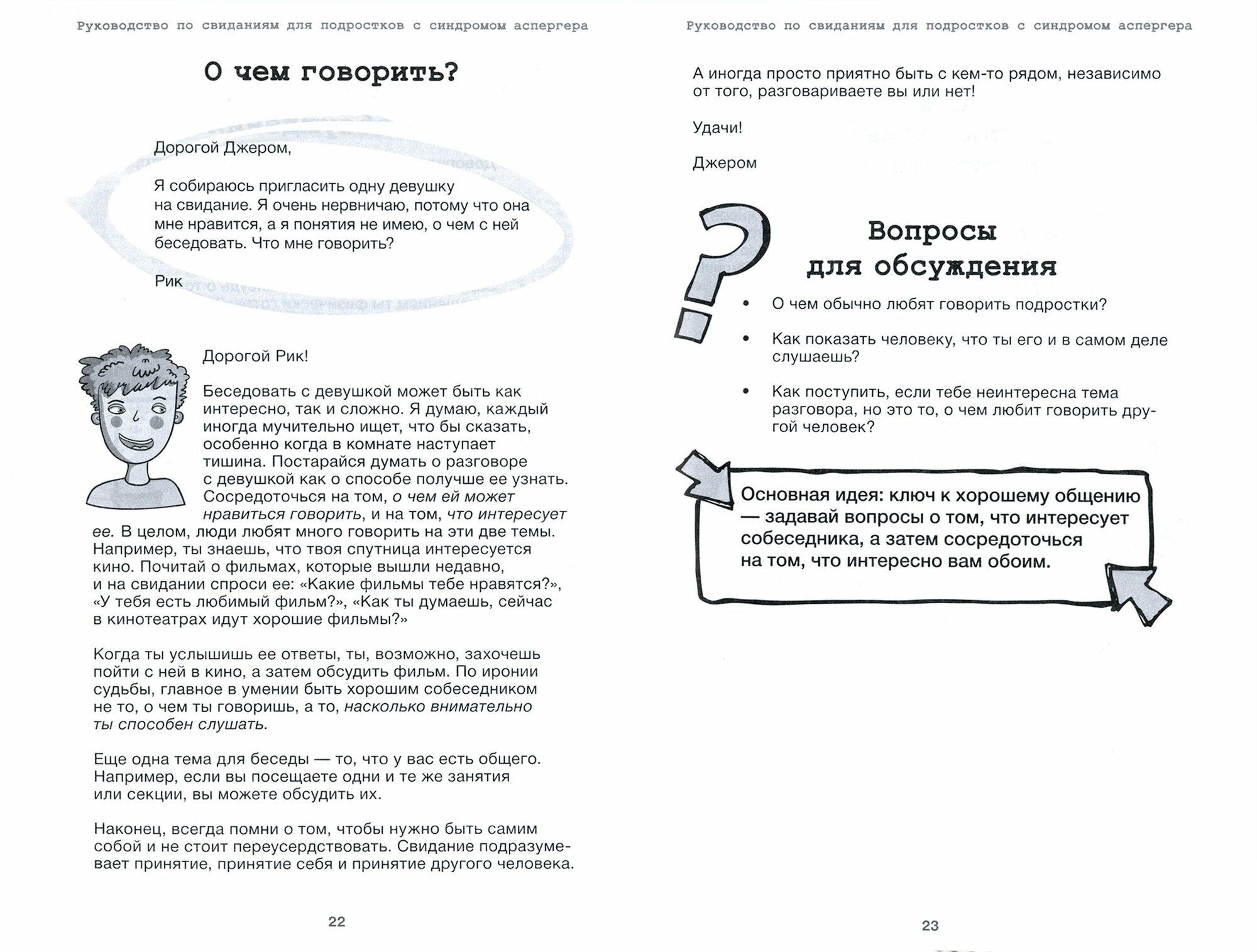 Руководство посвящено ряду проблем в социальных отношениях, с которыми сталкиваются молодые люди с синдромом Аспергера. Книга написана в формате "вопрос - ответ", описывает процесс знакомства и свиданий, развитие отношений и даже разрыв, который, возможно, придётся пережить подросткам. Руководство станет ценным ресурсом для подростков с с синдромом Аспергера, а также их родителей и учителей.