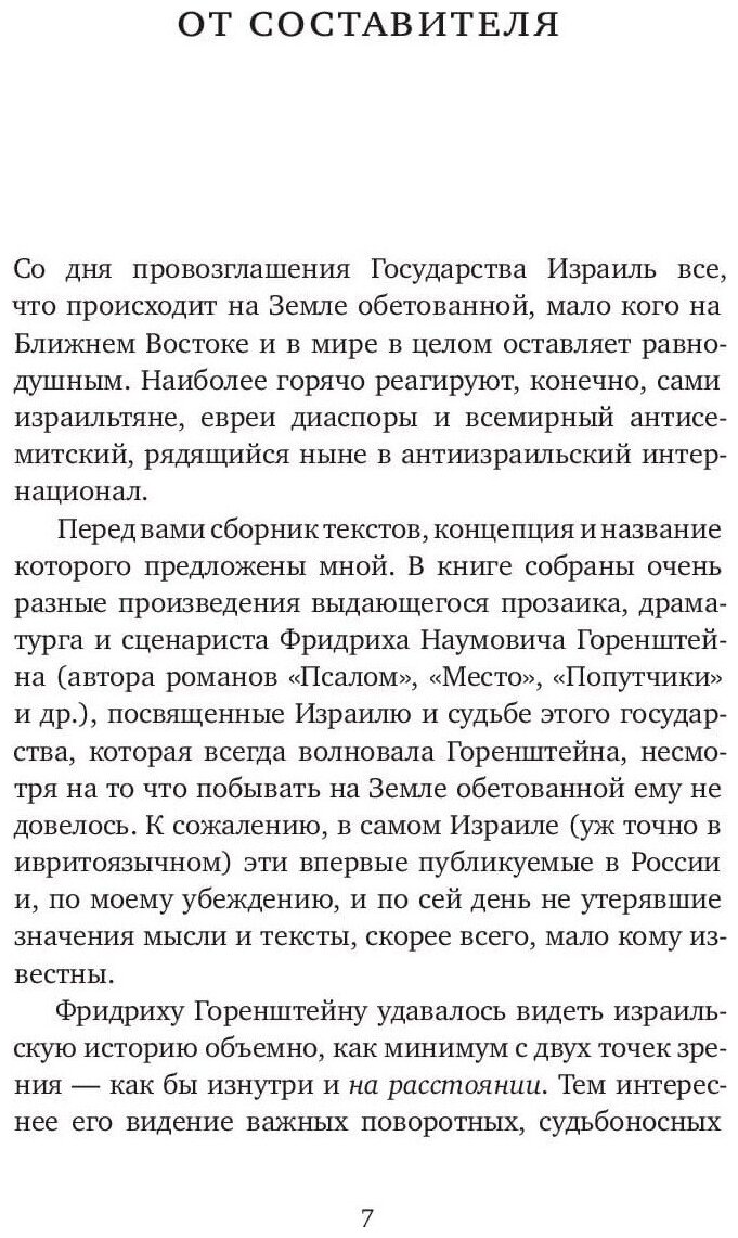 В сборнике представлены произведения выдающегося писателя Фридриха Горенштейна (1932-2002), посвященные Израилю и судьбе этого государства. Ранее не издававшиеся в России публицистические эссе и трактат-памфлет свидетельствуют о глубоком знании темы и блистательном даре Горенштейна-полемиста. Завершает книгу синопсис сценария "Еврейские истории, рассказанные в израильских ресторанах", в финале которого писатель с надеждой утверждает: "Был, есть и будет над крышей еврейского дома Божий посланец, Ангел-хранитель, тем более теперь не под чужой, а под своей, ближайшей, крышей будет играть музыка, слышен свободный смех…"