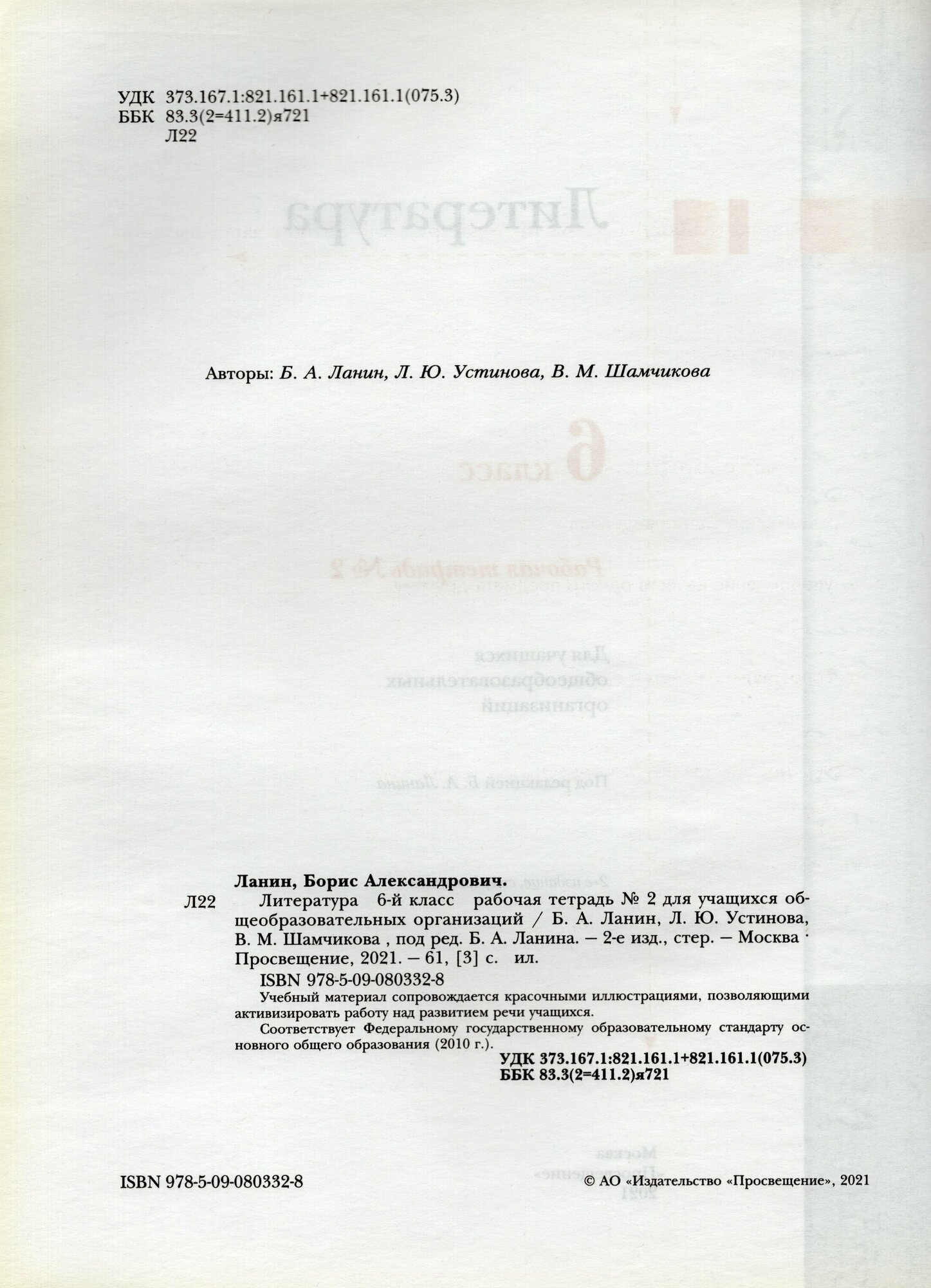 Литература. 6 класс. Рабочая тетрадь. Часть 2 (Устинова Людмила Юрьевна, Ланин Борис Александрович, Шамчикова Валентина Максимовна); Просвещение/Вентана-Граф, 2021