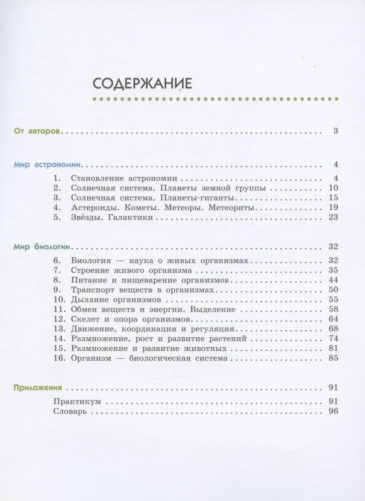 Учебник для 6 класса включает 4 раздела: "Мир астрономии", "Мир биологии", "Мир физики" и "Мир химии".