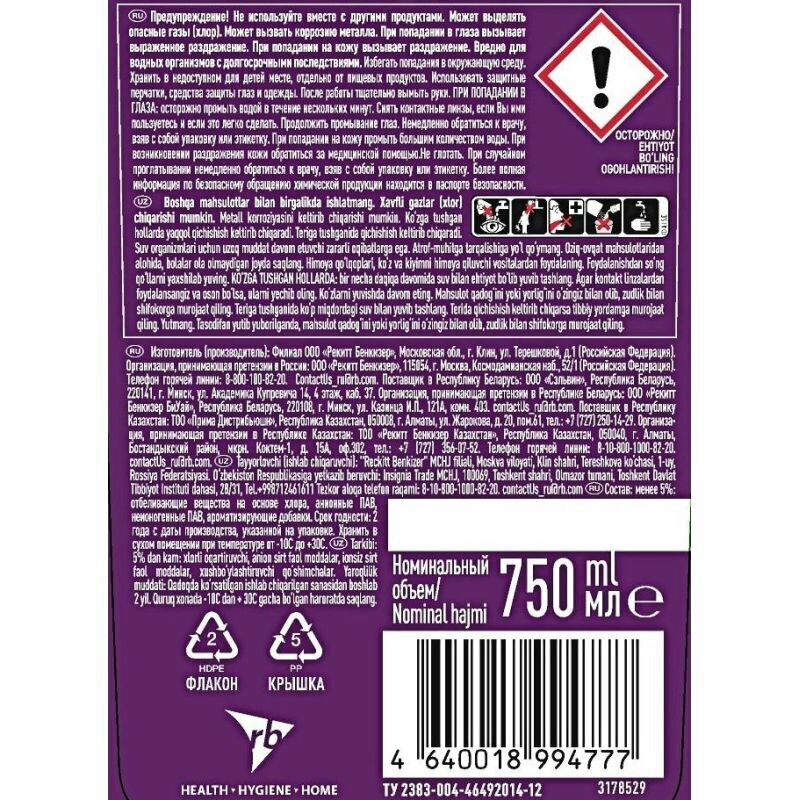 | Химический состав | Менее 5%: отбеливающие вещества на основе хлора, анионные ПАВ, неионогенные ПАВ, ароматизирующие добавки. |