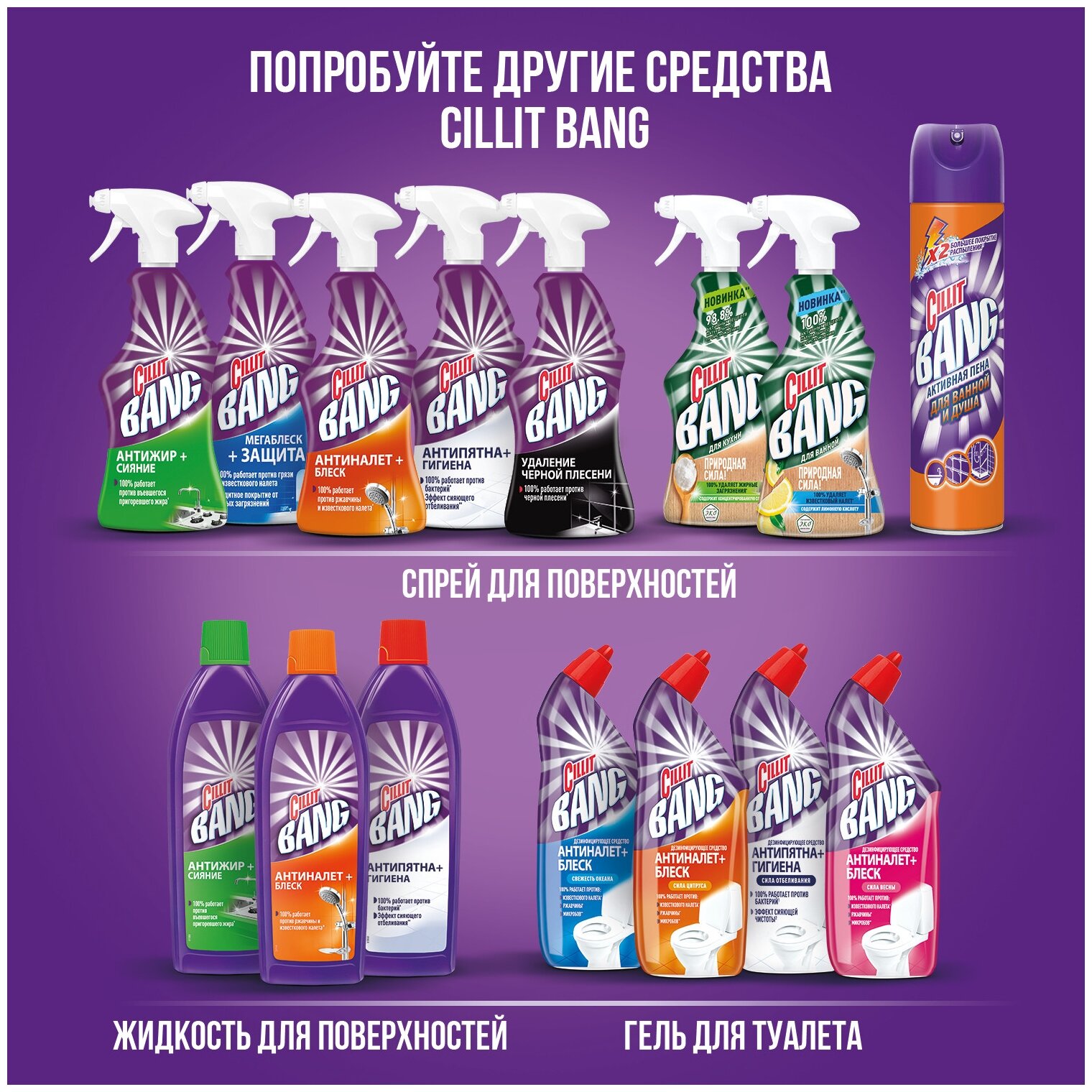 Мощное средство От пятен и плесени. Беспощаден к плесени и эффективен против более чем 40 видов других загрязнений! Cillit BANG Мощное средство От пятен и плесени устраняет плесень, жир, грязь и придает поверхностям ослепительный блеск! Удобный спрей Cillit BANG Мощное средство От пятен и плесени: Это средство с распылителем легко удалит самые стойкие загрязнения, уничтожит микробы и бактерии и придаст невероятный блеск вашим поверхностям! Его мощная формула без труда удаляет загрязнения, убивает бактерии и придает суперблеск вашим поверхностям. Cillit BANG От пятен и плесени идеален для ванной и кухни: он придает вашим керамическим поверхностям сияющую чистоту!