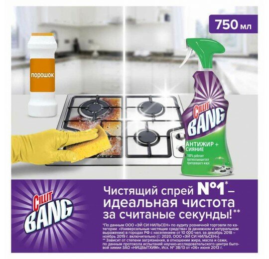 Мощное средство Cillit Bang АнтиЖИР+Сияние. BANG и грязи как не бывало!Попробуйте по-настоящему мощное средство CILLIT BANG антиЖИР+СИЯНИЕ! Оно эффективно удаляетдаже въевшийся пригоревший жир, а также масляные пятна и грязь за секунды! Чистые поверхности блестят как новые!Идеально подходит для ежедневной уборки кухонных поверхностей различного происхождения (в том числе мрамор, натуральный камень) и принадлежностей, таких как гарнитур (столешницы), плита, противни, кастрюли, сковороды, шампуры, гриль, разделочные доски и т. д.
