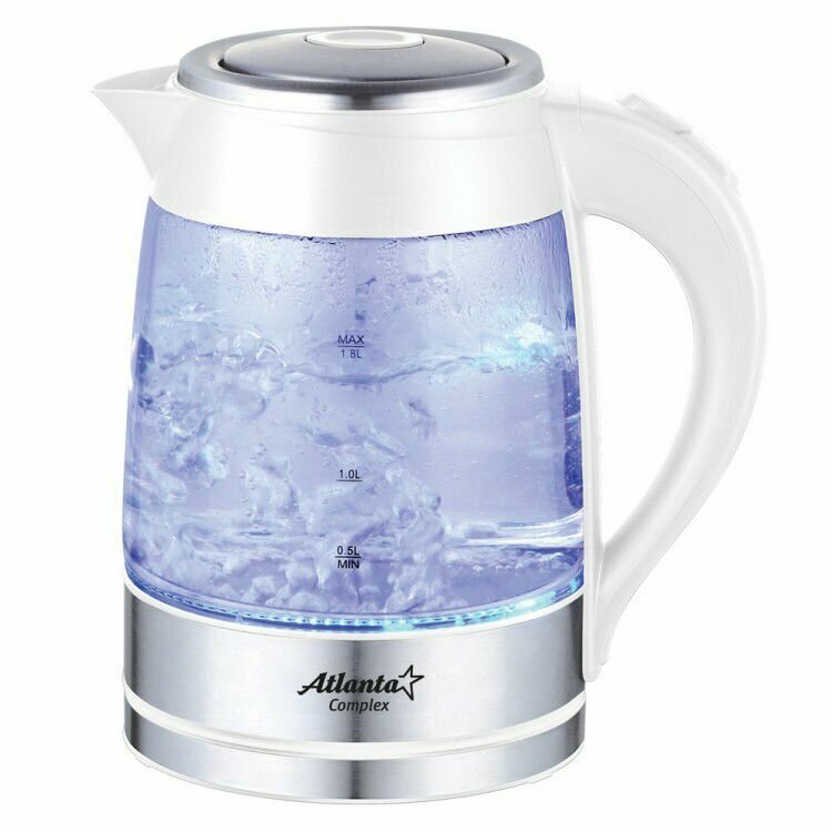 Atlanta это электрический чайник с корпусом из термостойкого стекла и эффектной иллюминацией. Чайник быстро кипятит воду и отключается автоматически после закипания. Качественный, термоустойчивый пластик не выделяет вредных веществ. Чайник мощностью 2000 Вт и объемом 1,8 л. Имеет скрытый нагревательный элемент из стали, вращается на 360 градусов. Такой элегантный чайник станет превосходным украшением любого чаепития и вашей кухни.