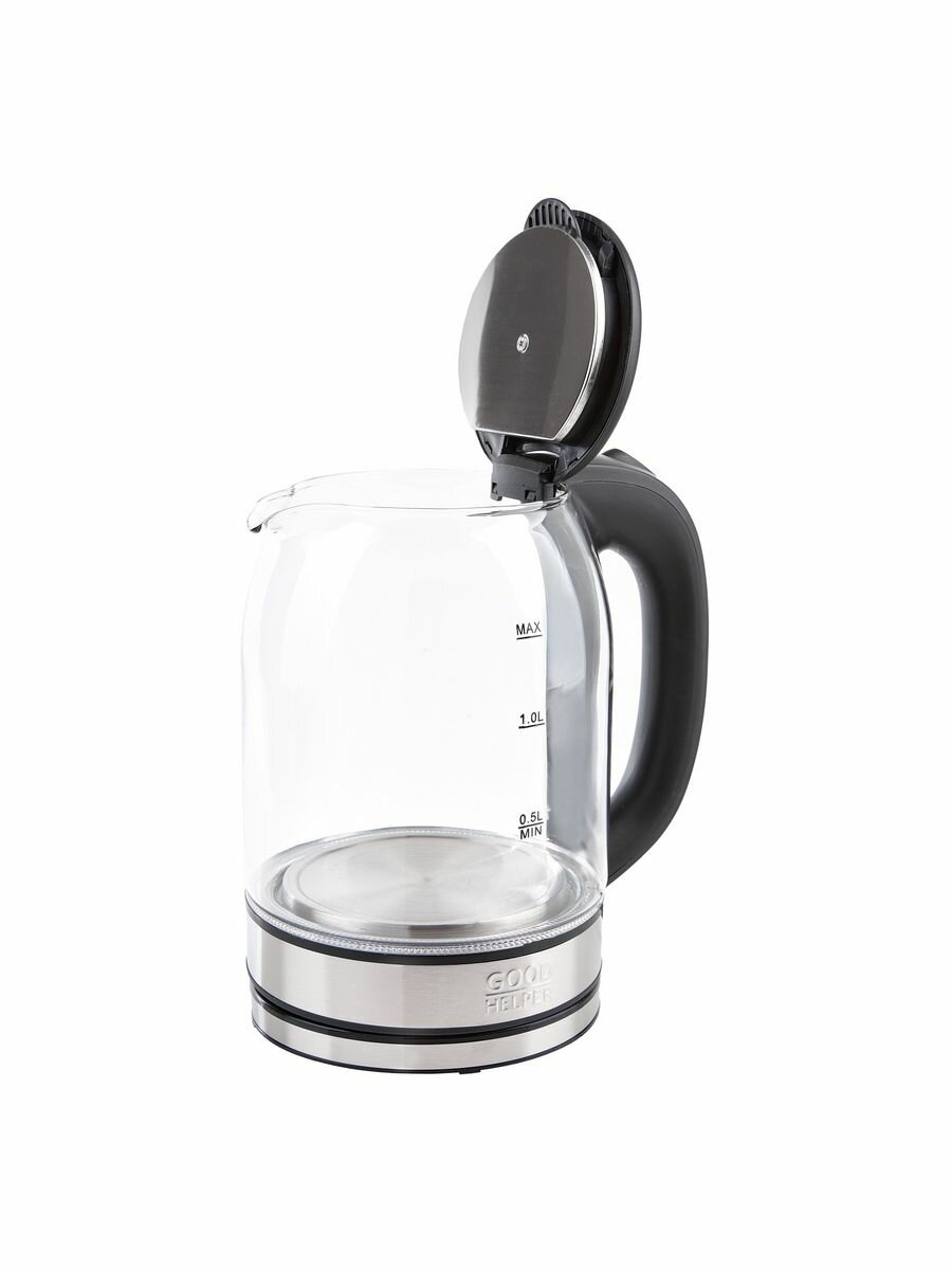 Электрический чайник Goodhelper , мощность которого составляет 1500 Вт, быстро кипятит воду.стильный И удобныйВажная особенность устройства – прозрачная колба с градуировкой, сделанная из прочного стекла, которое устойчиво к высокой температуре. Эргономичная пластиковая ручка не скользит в ладони и позволяет легко поднимать прибор и наклонять его, чтобы наполнить чашки.безопасностьВ этой модели предусмотрена защита от «сухого» включения, чтобы избежать перегрева при отсутствии воды в резервуаре. Также она отключается автоматически при закипании.
