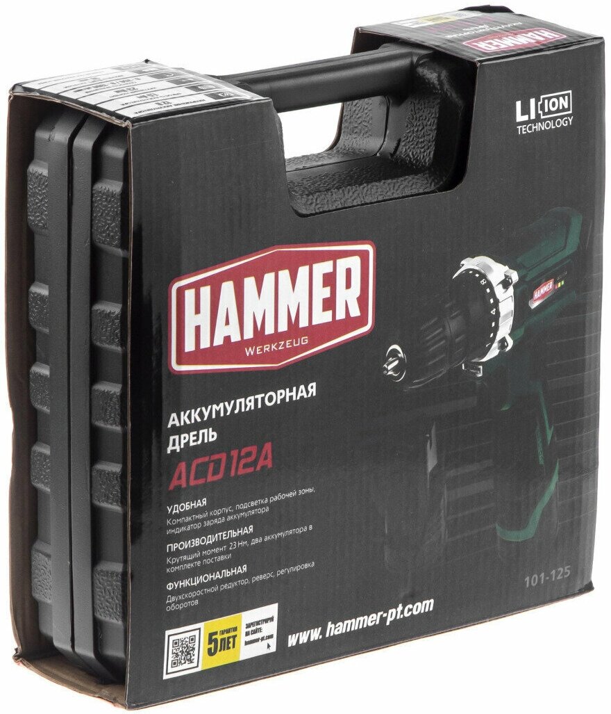 HAMMER ACD12A – аккумуляторная дрель-шуруповёрт, предназначена для работы с различным крепежом: винты, шурупы, болты. Сверлит отверстия диаметром до 16 мм в дереве и до 8 мм в металле. Работает от Li-Ion батареи 12 В (два аккумулятора и зарядное устройство входят в комплект). · Максимальные обороты: 1300 об/мин · Крутящий момент: 23 Нм · Положений закручивания: 22 · Гарантия: 5 лет Особенности модели ACD12A: Шуруповёрт поддерживает 2 скорости вращения: первая для закручивания, вторая – для сверления. Удобно настраивать инструмент для разных работ. Li-Ion аккумулятор не теряет заряда при хранении и не имеет эффекта памяти. Защищён от глубокой разрядки. Индикатор на корпусе показывает остаток заряда батареи. Легко контролировать оставшееся время работы. Быстрозажимной патрон позволяет менять оснастку за пару секунд. Не нужны дополнительные инструменты. Светодиодная подсветка рабочей зоны поможет работать в плохо освещённом помещении. Удобно работать в сумерках. Прочный кейс поставляется вместе с инструментом. В нём удобно хранить и перевозить шуруповёрт. Hammer Werkzeug — производитель бытового и профессионального электроинструмента, измерительной, силовой и садовой техники. Предприятие основано в 1980 году в Чехии. Официальный дилер в России – компания «220 Вольт».