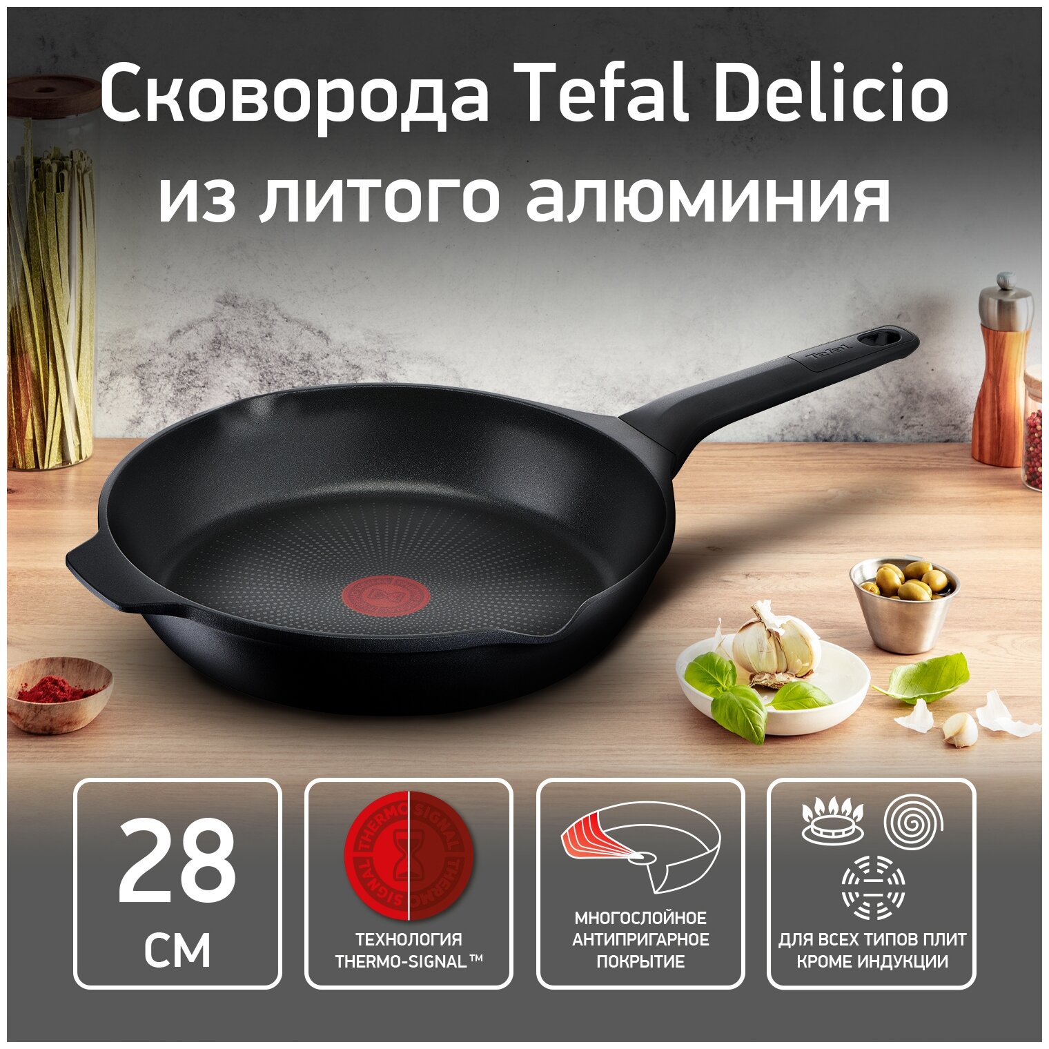 | Прочие особенности и свойства | Откройте заново вкус и аромат любимых домашних блюд вместе с элегантной посудой из литого алюминия, которая выглядит так же безупречно, как и готовит. , , Сковорода Tefal Delicio выполнена из прочного литого алюминия и имеет высококачественное антипригарное покрытие внутри и снаружи, поэтому каждое блюдо в ней получается сочным и аппетитным! Толстое дно гарантирует отличное распределение нагрева для равномерного приготовления всех ингредиентов. , , Эксклюзивный индикатор температуры Thermo-Signal подсказывает, когда сковорода нагрелась до оптимальной температуры и можно начинать готовить. Сковорода Delicio продумана до мелочей - в ней даже есть удобные носики для слива жидкости и дополнительная мини-ручка. Домашние блюда – теперь еще вкуснее и красивее! |