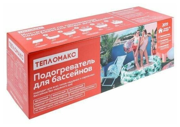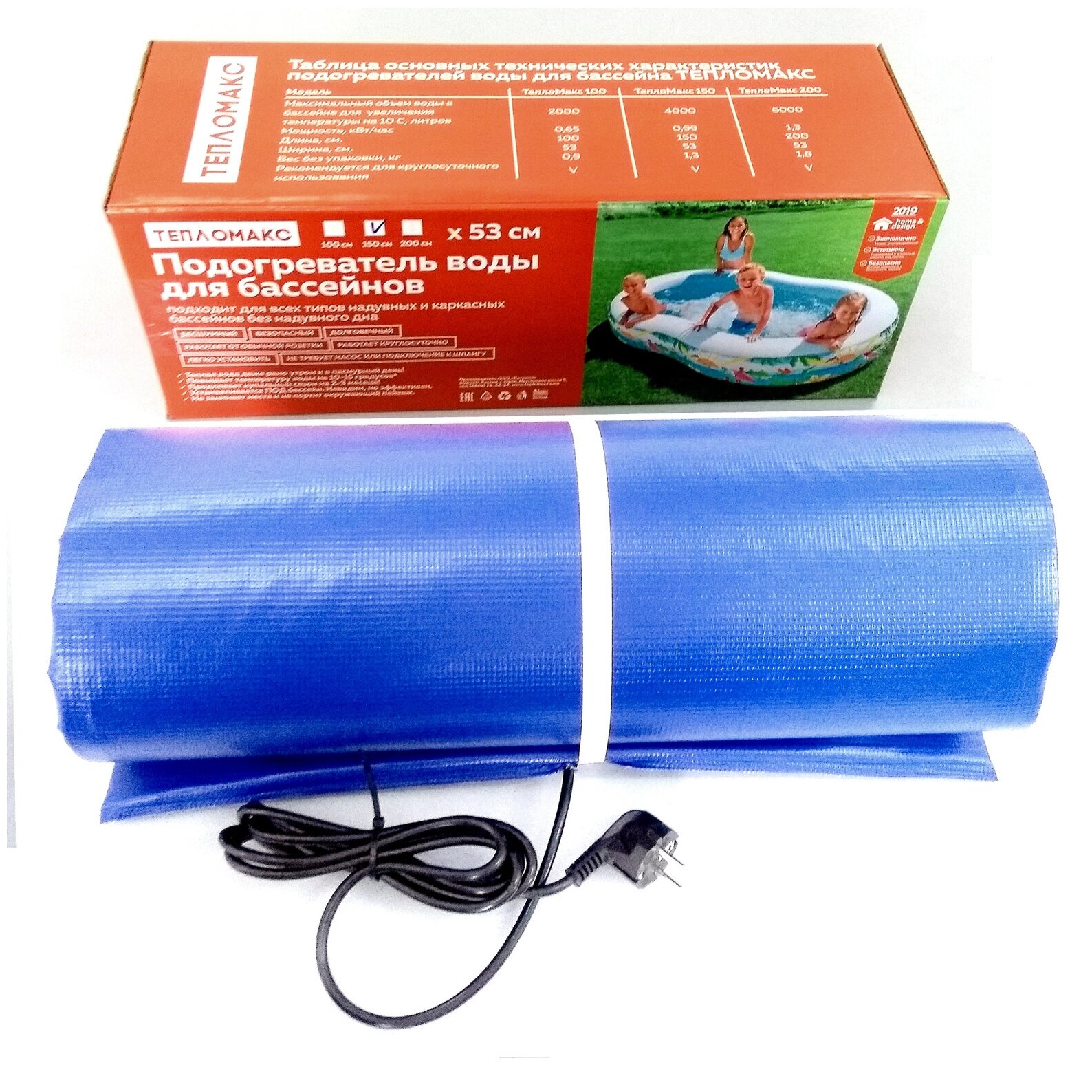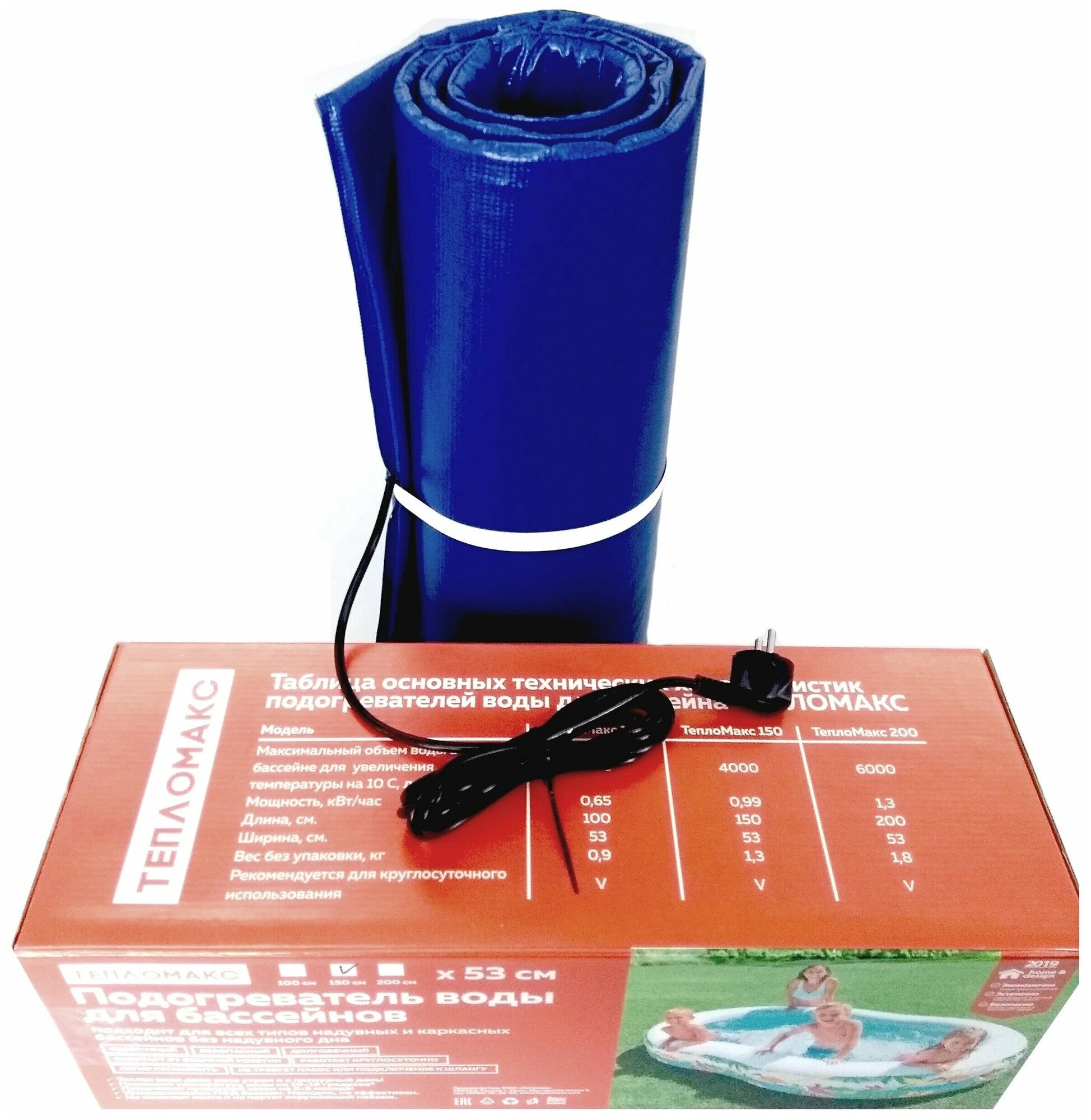 Подогреватель для всех типов надувных и каркасных бассейнов без надувного дна. Характеристики: Бесшумный, безопасный, долговечный, работает от обычной разетки, работает круглосуточно.Мощность 0,99 кВт/час, длина 150 см, ширина 53 см. Вес 1,3 кг. Максимальный объем воды в бассейне до 4000 л.Изделие размещается под бассейном, в результате чего не мешает при купании. Подогрев воды равномерный. Прогрев максимального объема воды до максимальной температуры потребуется примерно 24 часа. Повышает температуру воды на 10-15 градусов.