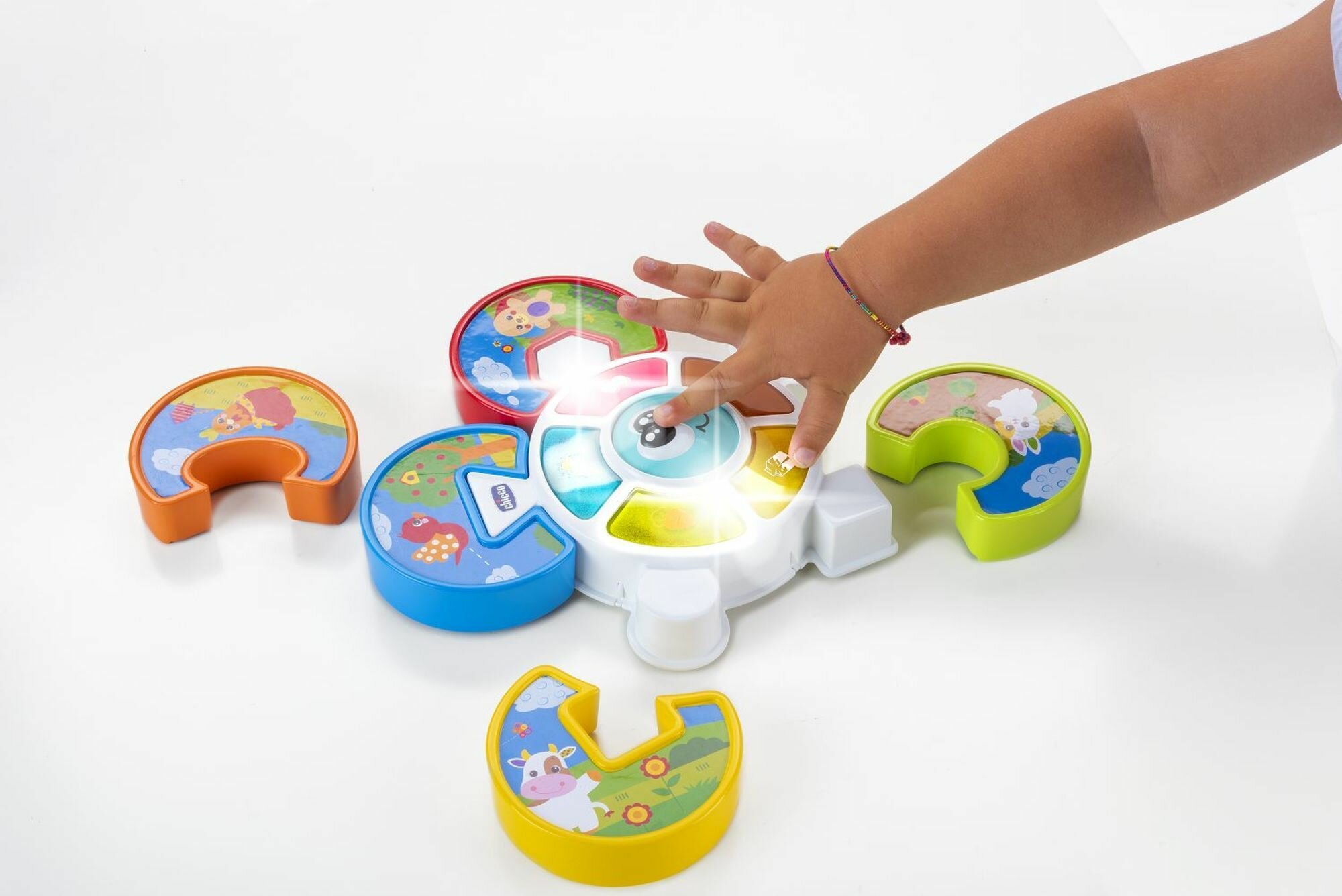 Игрушка пазл познакомит малыша с различными животными и звуками, которые они издают. Нажмите на забавную центральную часть, чтобы начать игру и активировать последовательность огней с забавным звуком. Как только последовательность остановится, присоедините животное в пазле с подсвеченным элементом. Когда ребенок вставляет правильный элемент пазла, воспроизводится звук этого животного, а когда он собирает весь пазл, игрушка загорается и воспроизводит веселые мелодии.