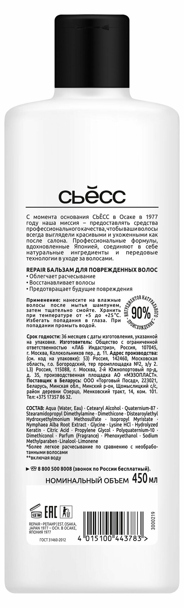 | Химический состав | Aqua, Cetearyl Alcohol, Quaternium-87, Stearamidopropyl Dimethylamine, Dimethicone, Distearoylethyl Hydroxyethylmonium Methosulfate, Isopropyl Myristate, Prunus Armeniaca Kernel Oil, Amodimethicone/Morpholinomethyl Silsesquioxane Copolymer, Tocopheryl Acetate, Panthenol, Hydrolyzed Keratin, Citric Acid, Propylene Glycol, Phenoxyethanol, Sodium Methylparaben, Glycerin, Parfum, Dimethiconol, Polyquatermium-37, Dicaprylyl Carbonate, Hexyl Cinnamal, Trideceth-5, Benzyl Salicylate, Ci 42053. |