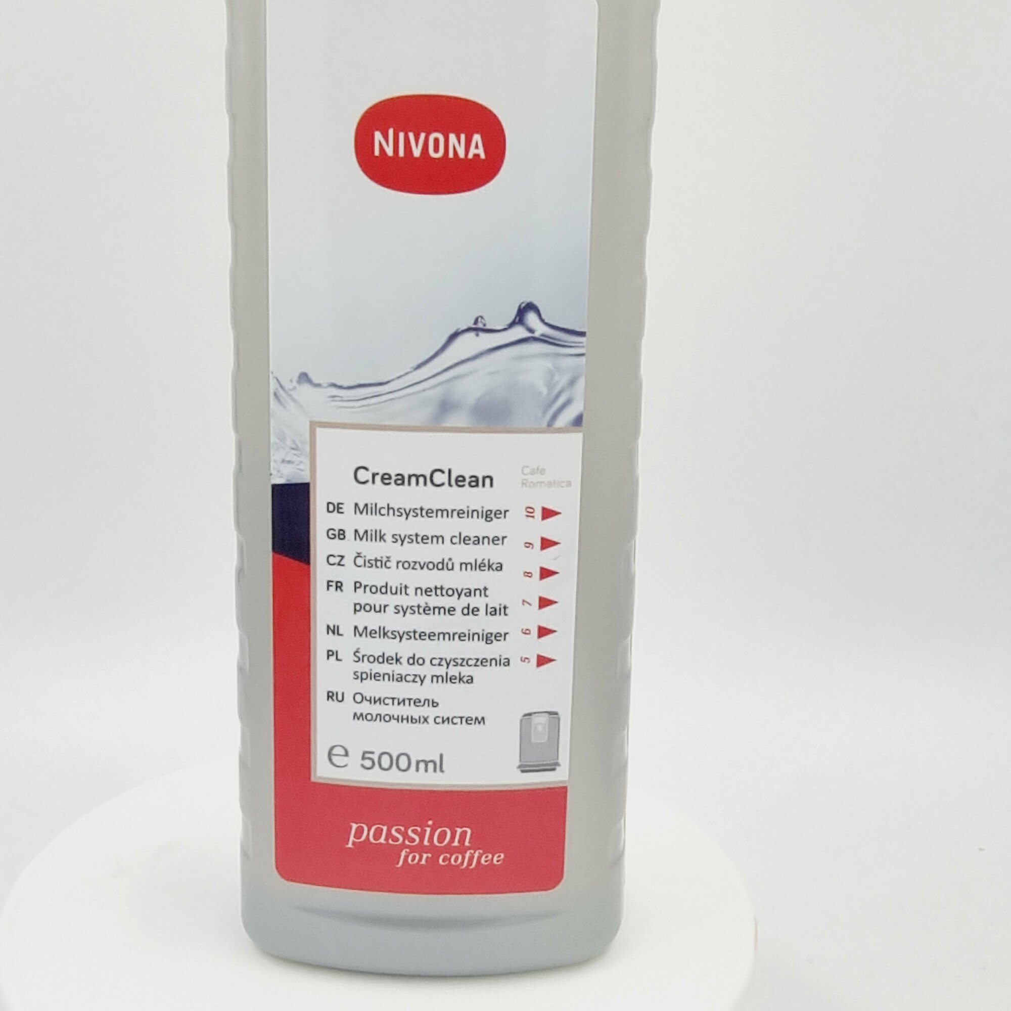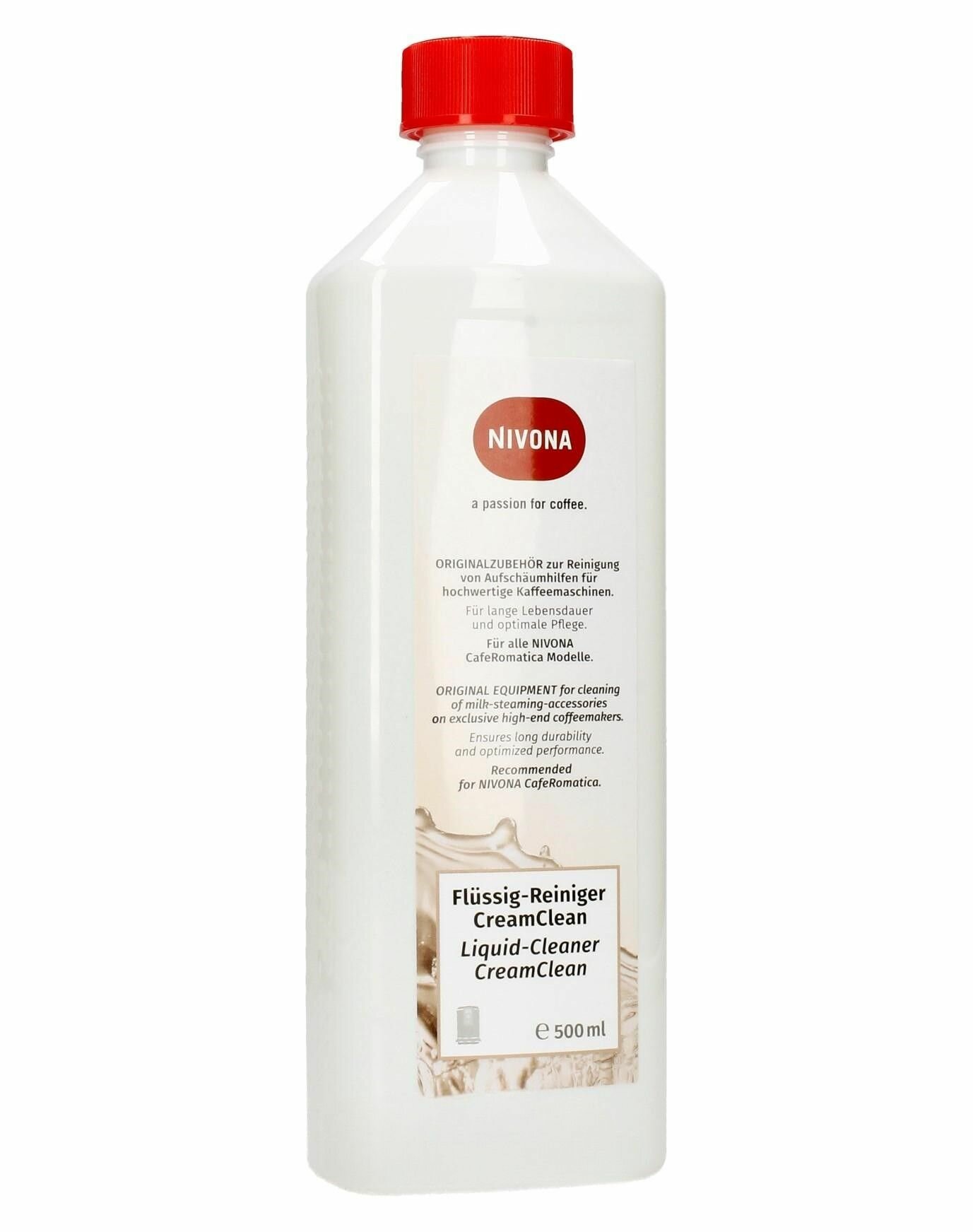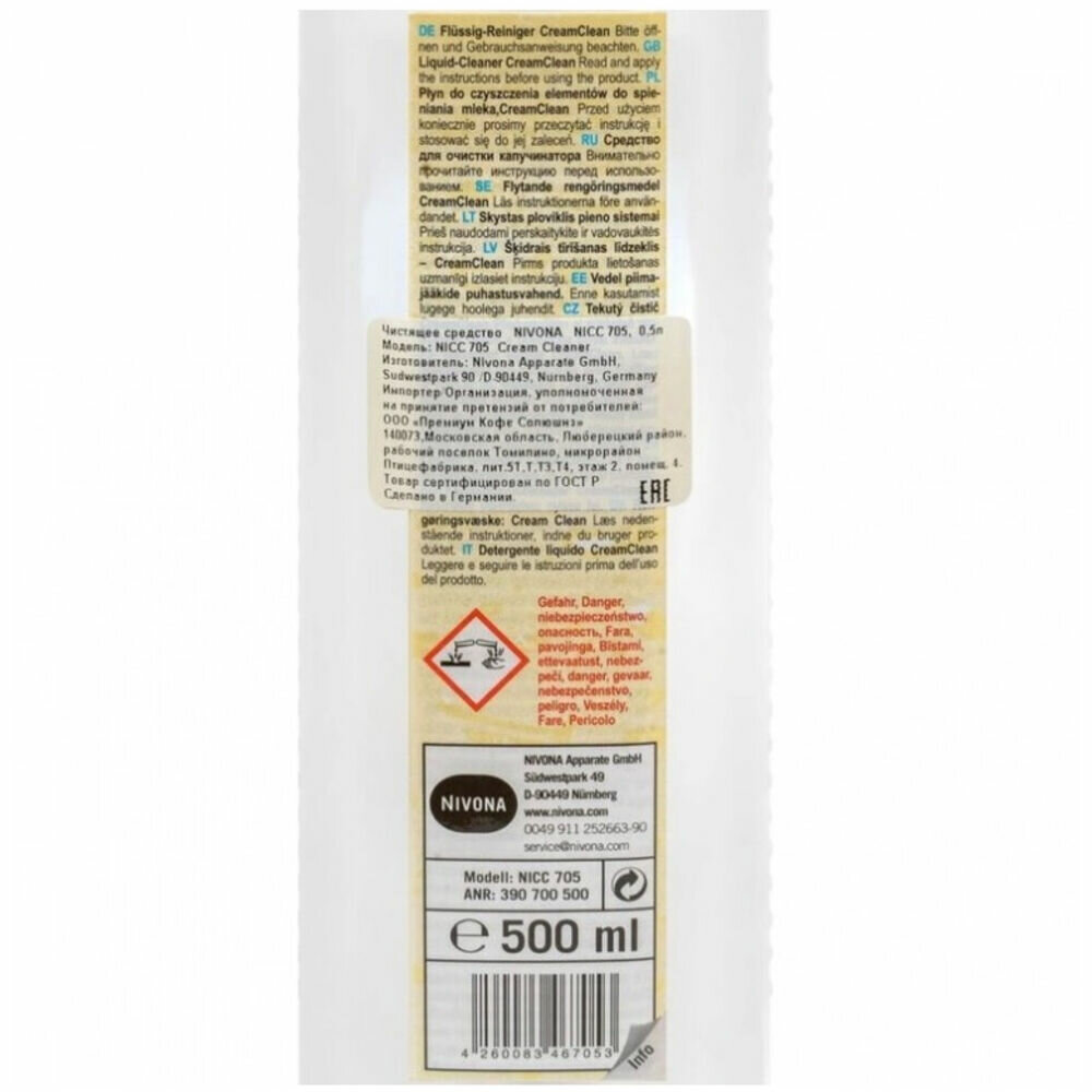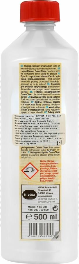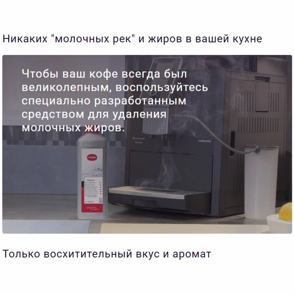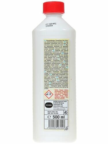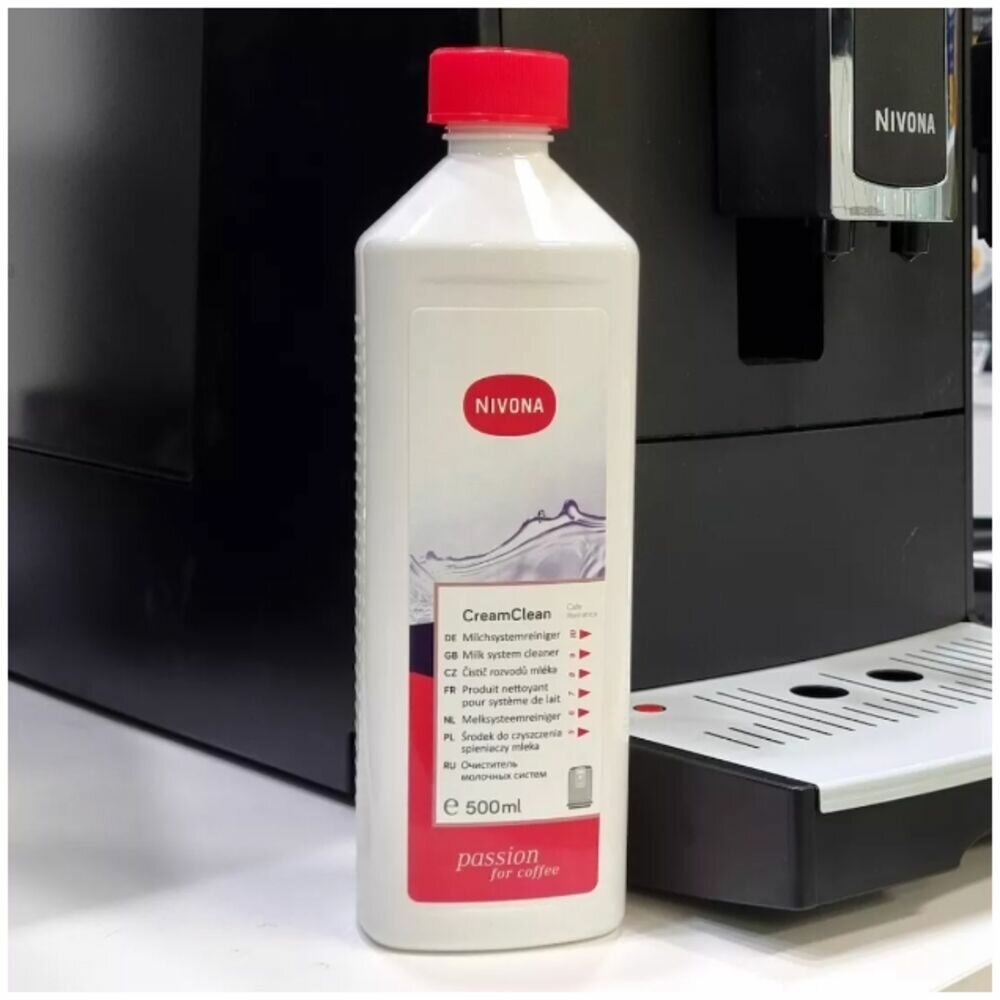 Чистящее средство NIVONA , совместимое с автоматическими кофемашинами с капучинатором от одноименного германского бренда, помогает справиться с молочными отложениями. Оно производится в жидкой форме и фасуется в белые бутылки по 500 мл.