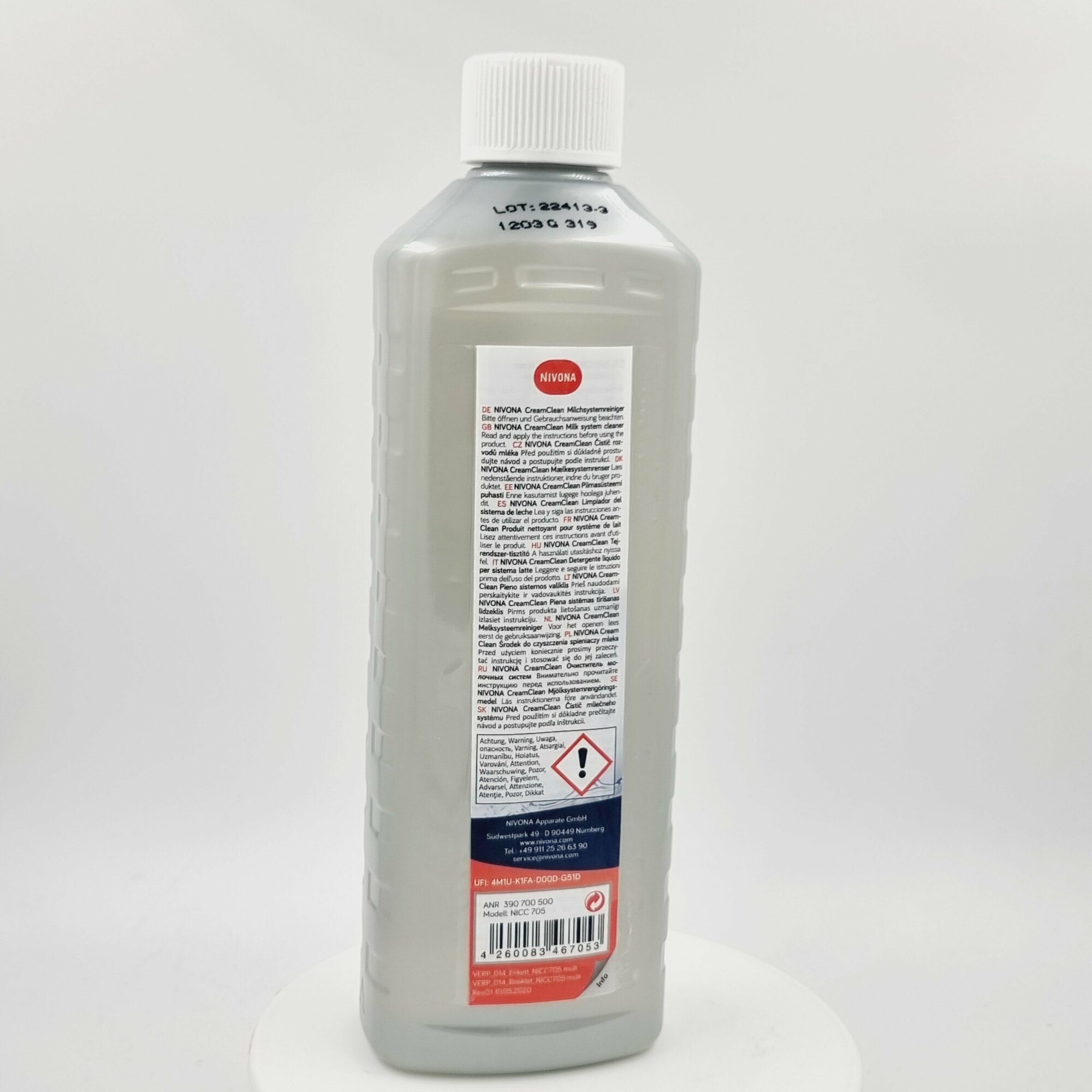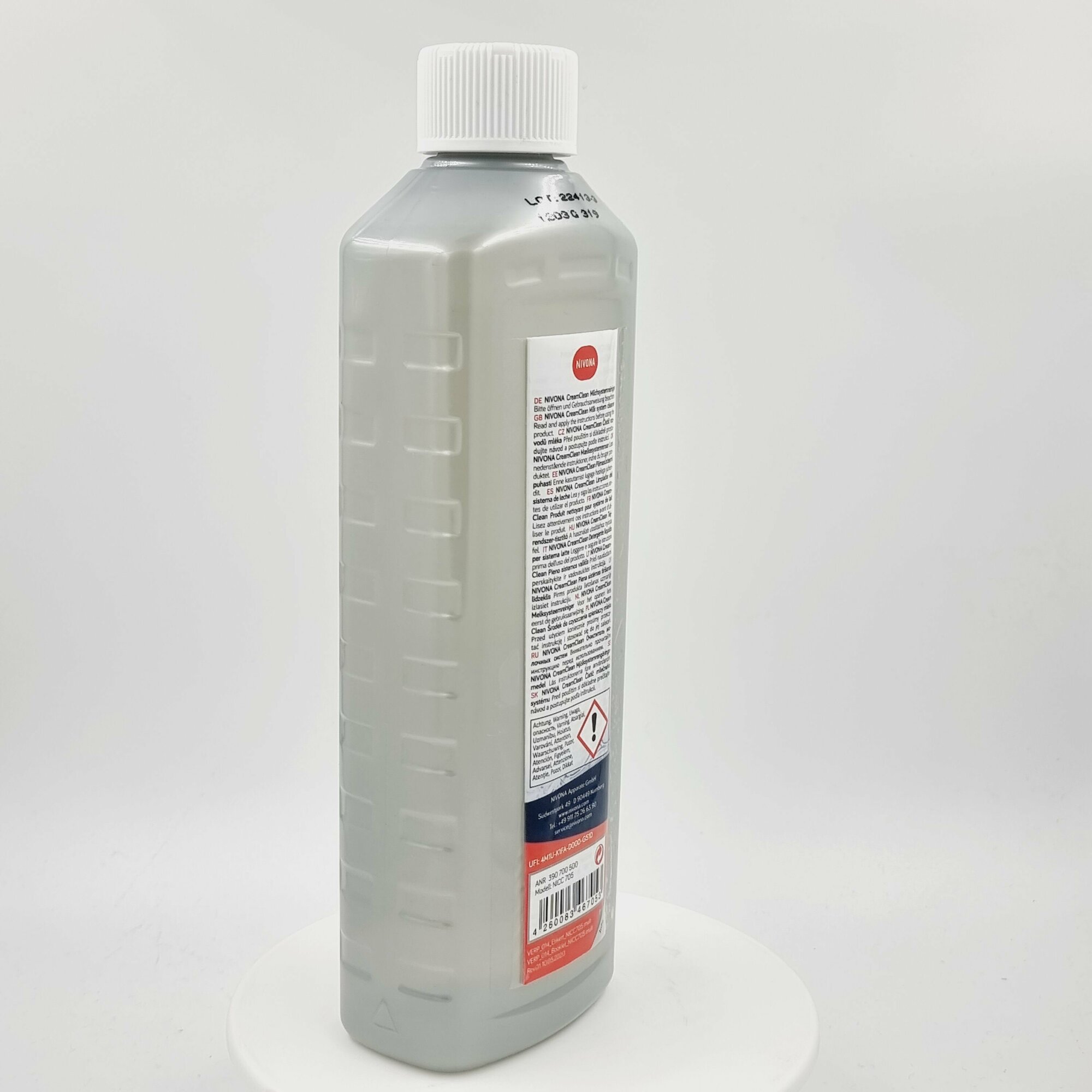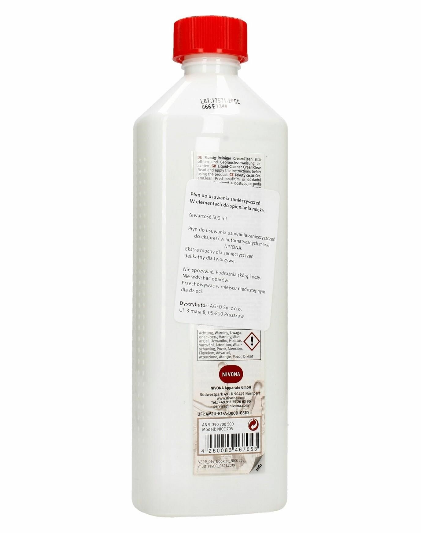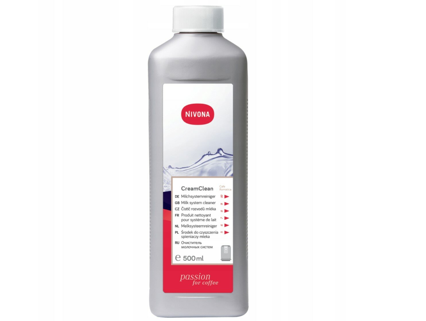 Чистящее средство NIVONA , совместимое с автоматическими кофемашинами с капучинатором от одноименного германского бренда, помогает справиться с молочными отложениями. Оно производится в жидкой форме и фасуется в белые бутылки по 500 мл.