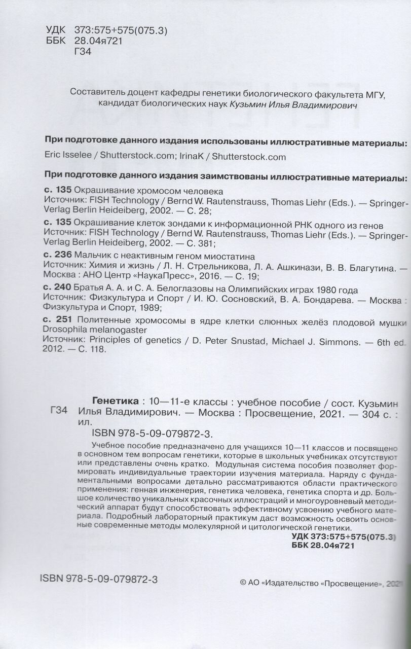 Учебное пособие предназначено для учащихся 10-11 классов и посвящено в основном тем вопросам генетики, которые в школьных учебниках отсутствуют или представлены очень кратко. Модульная система пособия позволяет формировать индивидуальные траектории изучения материала. Наряду с фундаментальными вопросами детально рассматриваются области практического применения: генная инженерия, генетика человека, генетика спорта и др. Большое количество уникальных красочных иллюстраций и многоуровневый методический аппарат будут способствовать эффективному усвоению учебного материала. Подробный лабораторный практикум даст возможность освоить основные современные методы молекулярной и цитологической генетики.