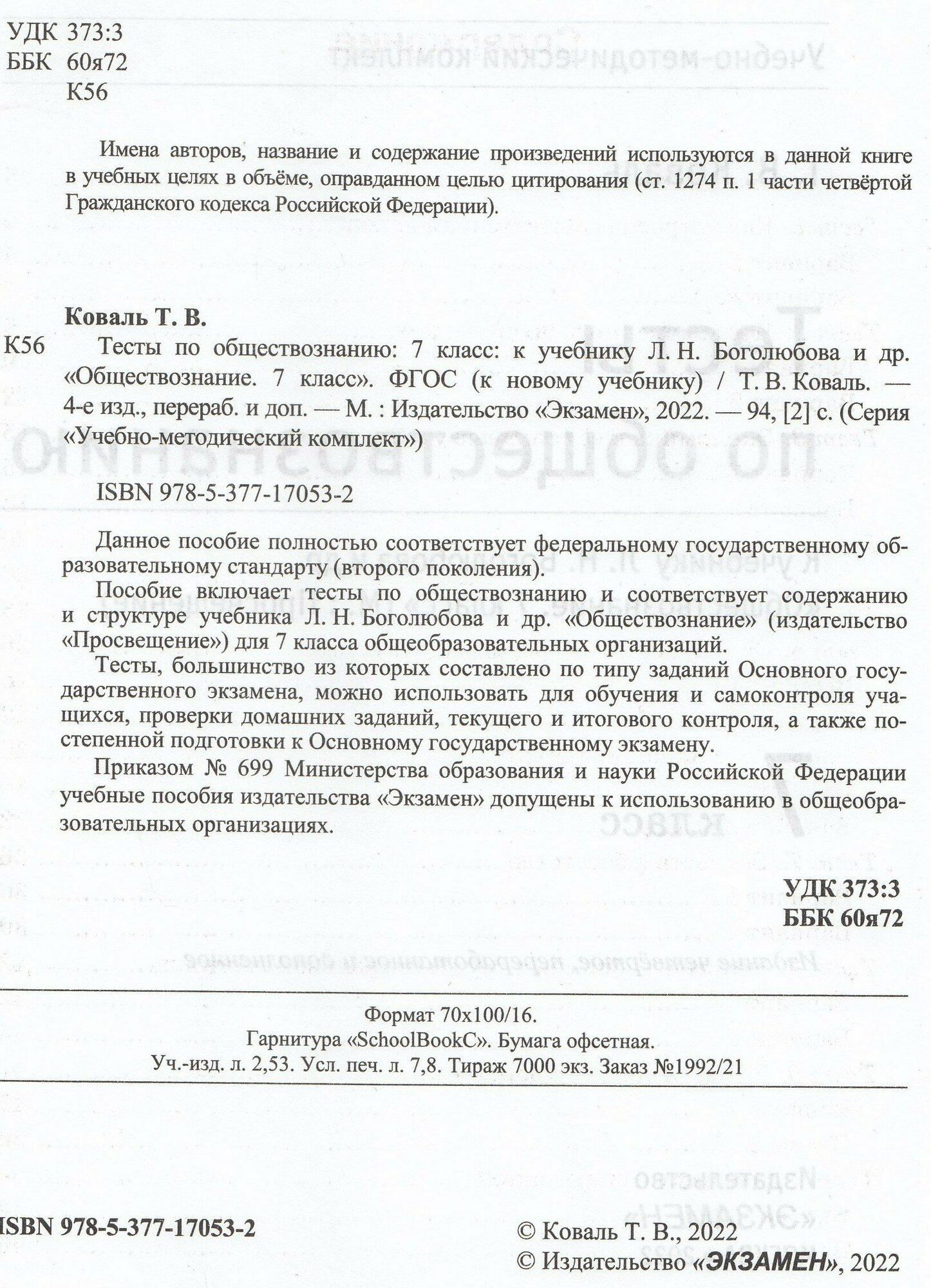 Тесты по обществознанию 7 класс К учебнику Л Н Боголюбова и др Обществознание (Коваль Татьяна Викторовна); Экзамен Издательство, 2022