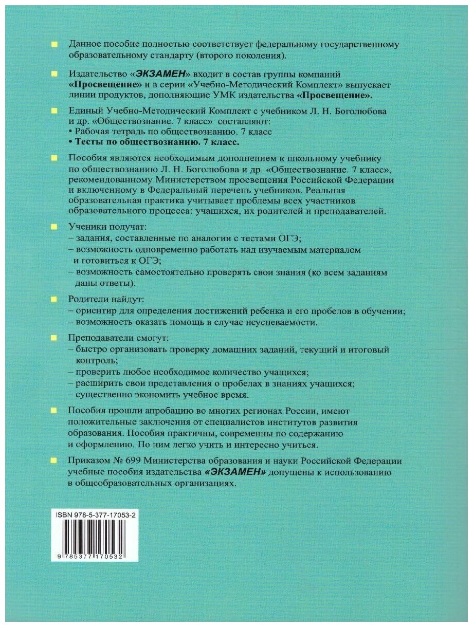 Пособие включает тесты по обществознанию и соответствует содержанию и структуре учебника под редакцией Л. Н. Боголюбова, Л. Ф. Ивановой "Обществознание" (издательство "Просвещение") для 7 класса общеобразовательных организаций.