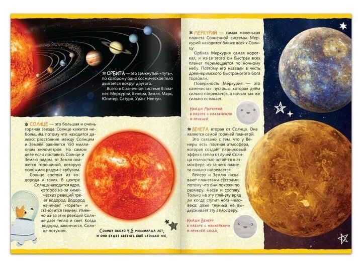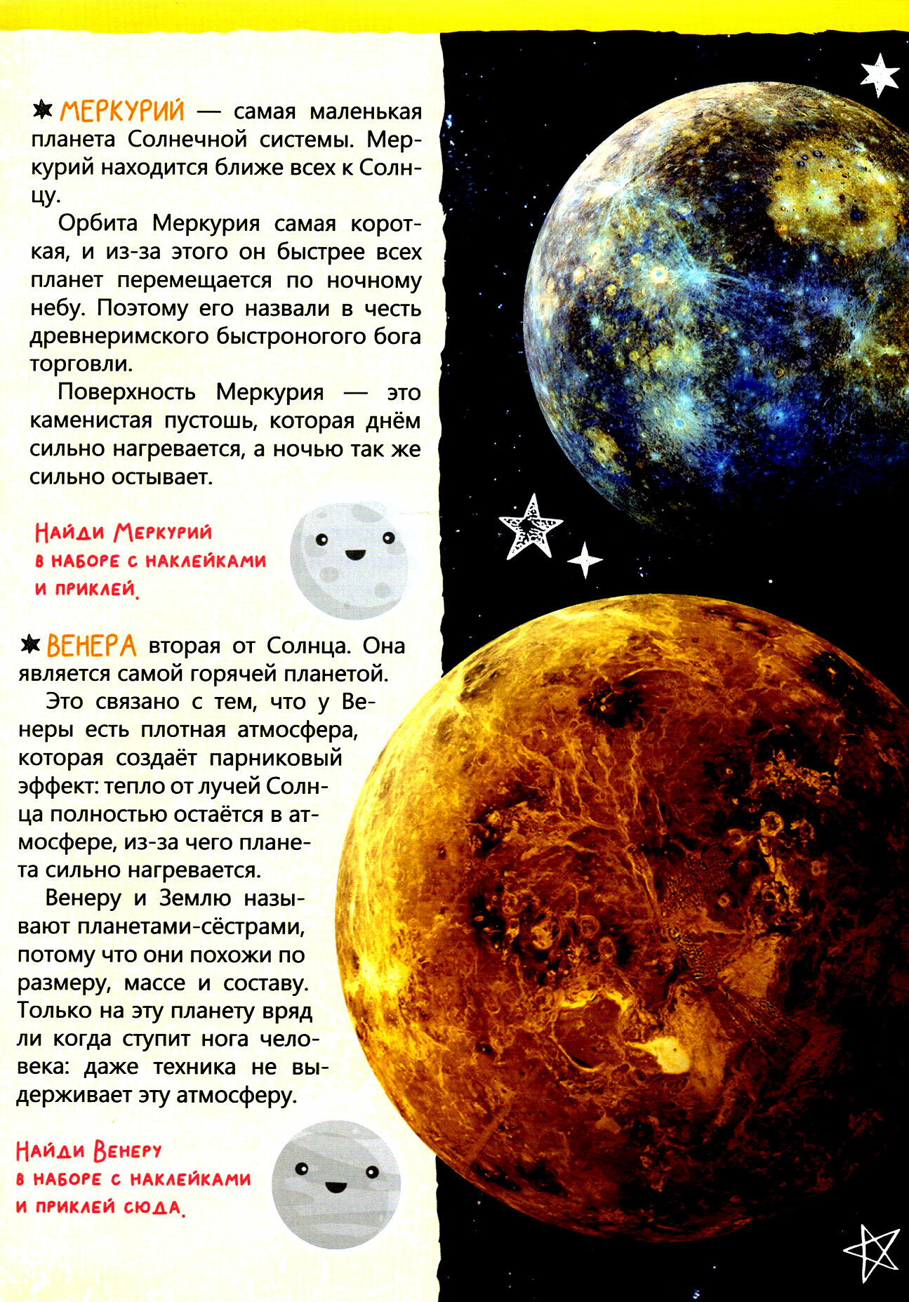 Книжка понравилась тем, что здесь информация нескучно написана, доступным языком и можно подкрепить информацию наклейками. Единственный минус, что пишут про размеры планет, что они разные, а в наклейках все планеты одного размера. И хотелось бы побольше картинку солнечной системы и чтобы и туда наклейки клеить.