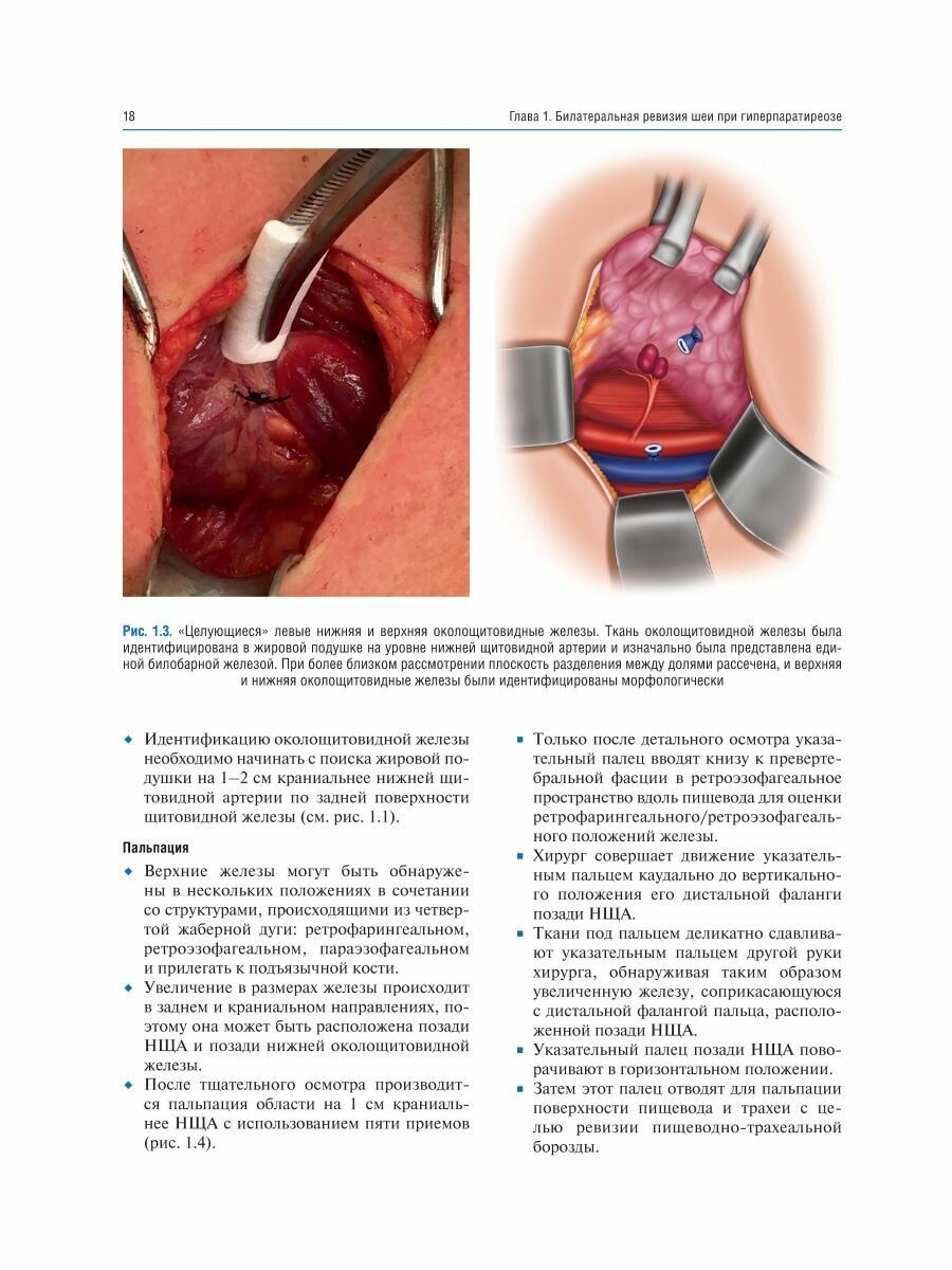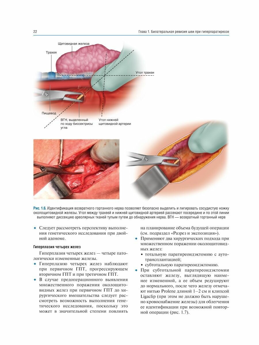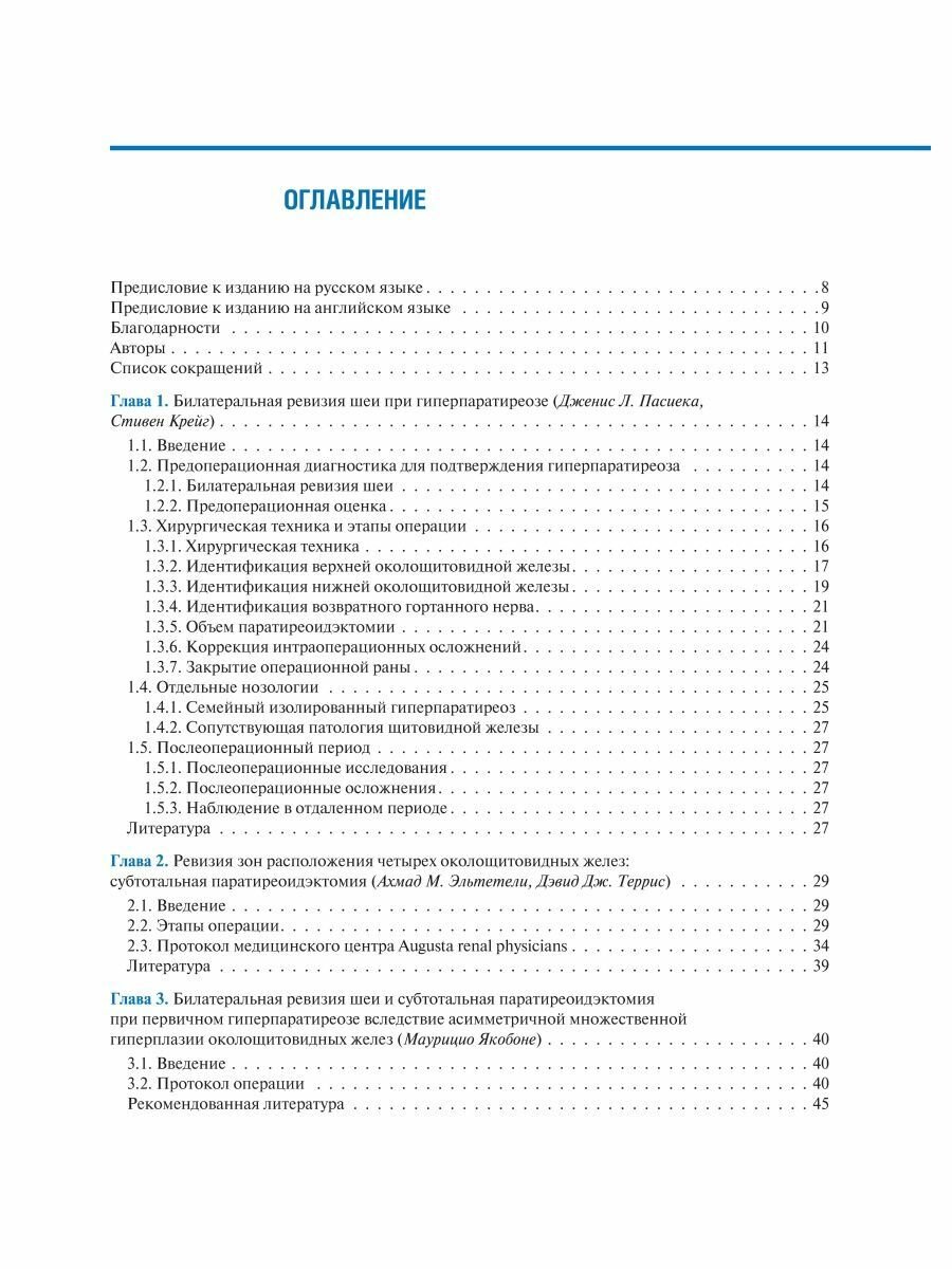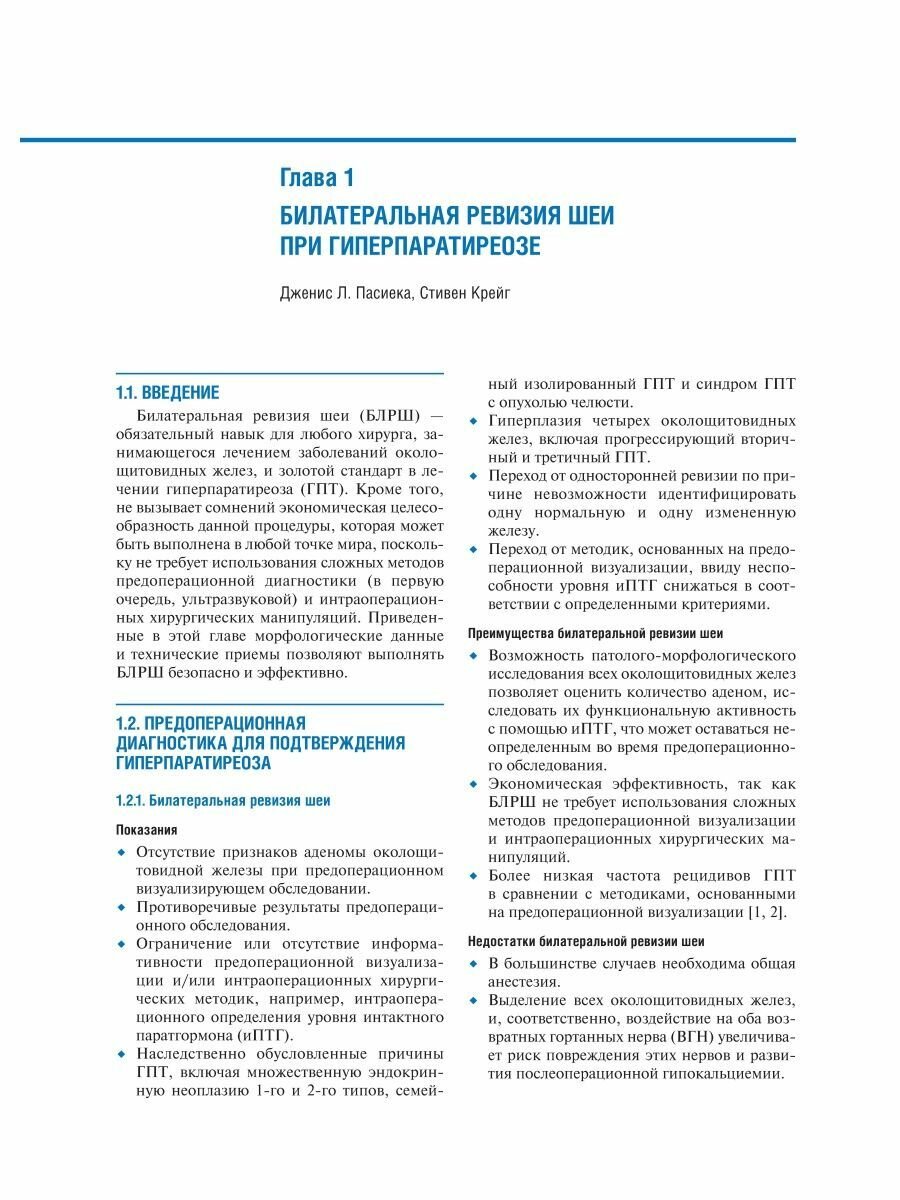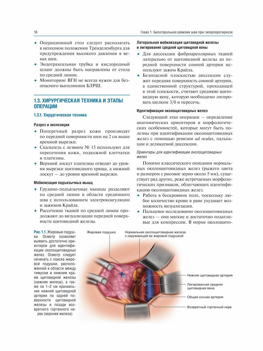 Приведено описание хирургической техники паратиреоидэктомии как при традиционном подходе - билатеральной ревизии шеи, так и при минимально инвазивных подходах - методике открытой минимально инвазивной, видеоассистированной, повторной паратиреоидэктомии, а также трансоральной эндоскопической паратиреоидэктомии через вестибулярный доступ и эндоскопической латеральной паратиреоидэктомии. В каждой главе представлено клиническое наблюдение, определяющее выбор хирургического вмешательства. Интраоперационные фотографии сопровождаются соответствующими рисунками для облегчения понимания анатомических структур и ориентиров, а также этапов хирургического вмешательства.
