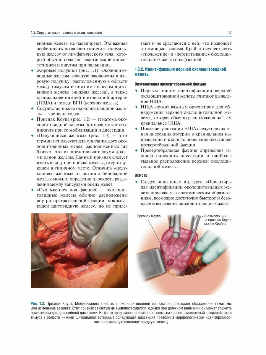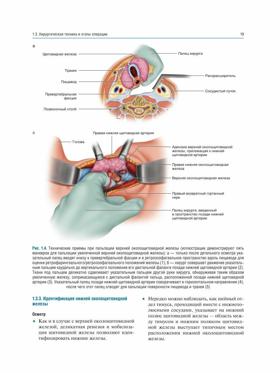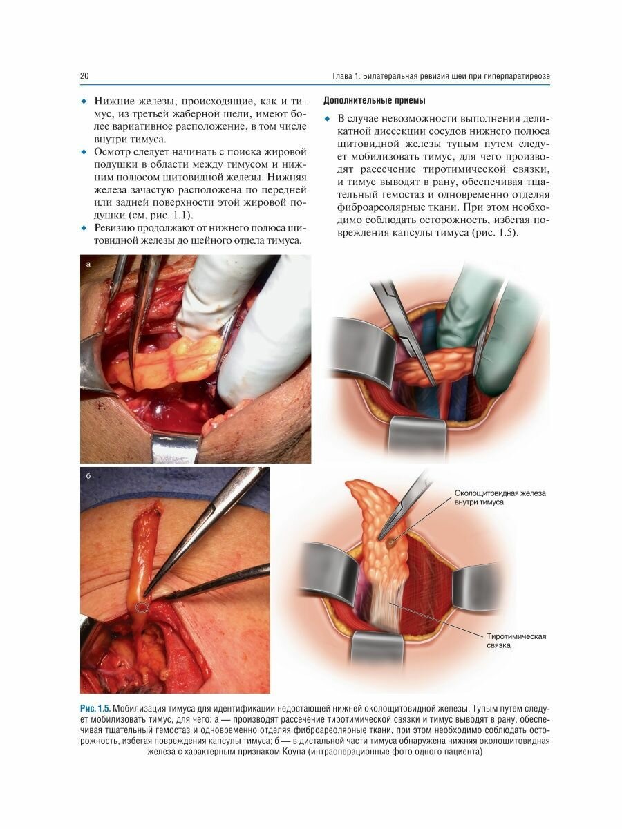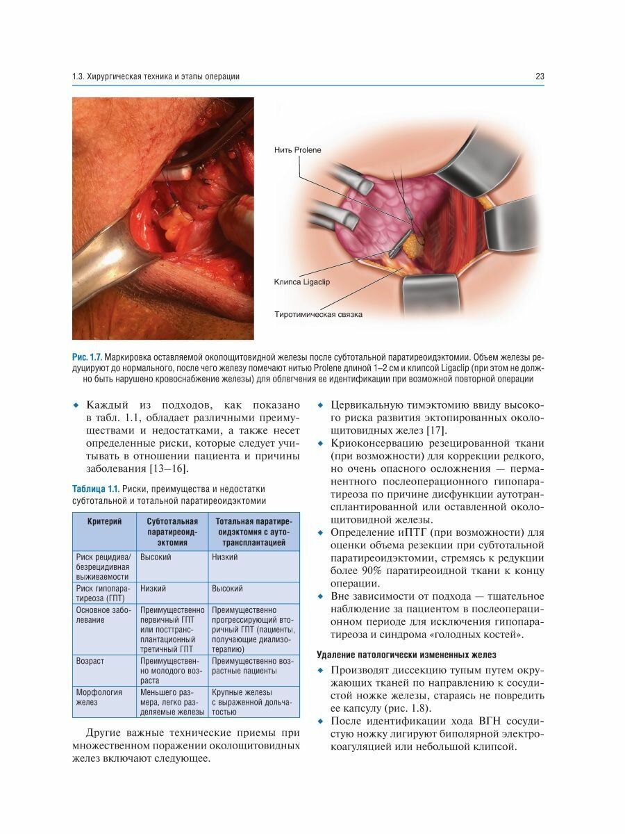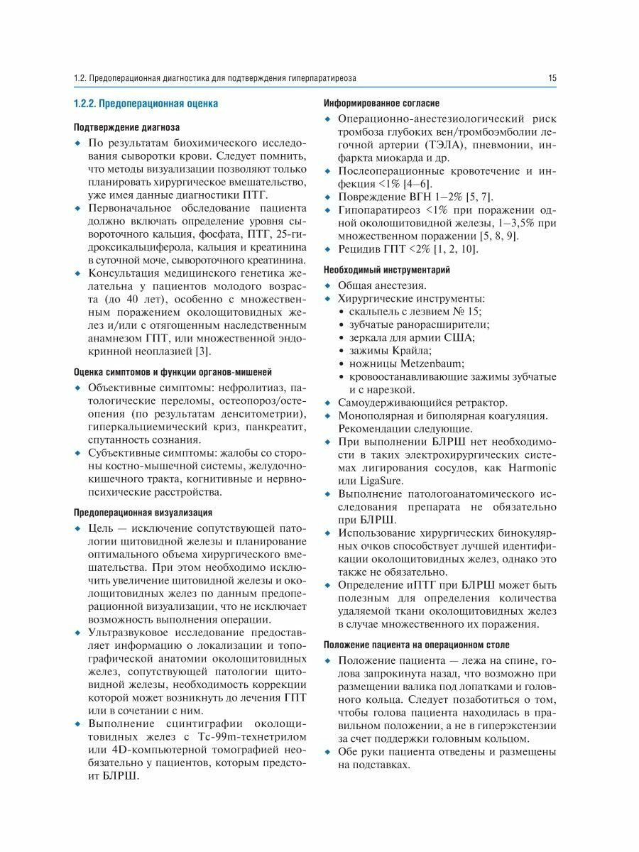 Приведено описание хирургической техники паратиреоидэктомии как при традиционном подходе - билатеральной ревизии шеи, так и при минимально инвазивных подходах - методике открытой минимально инвазивной, видеоассистированной, повторной паратиреоидэктомии, а также трансоральной эндоскопической паратиреоидэктомии через вестибулярный доступ и эндоскопической латеральной паратиреоидэктомии. В каждой главе представлено клиническое наблюдение, определяющее выбор хирургического вмешательства. Интраоперационные фотографии сопровождаются соответствующими рисунками для облегчения понимания анатомических структур и ориентиров, а также этапов хирургического вмешательства.