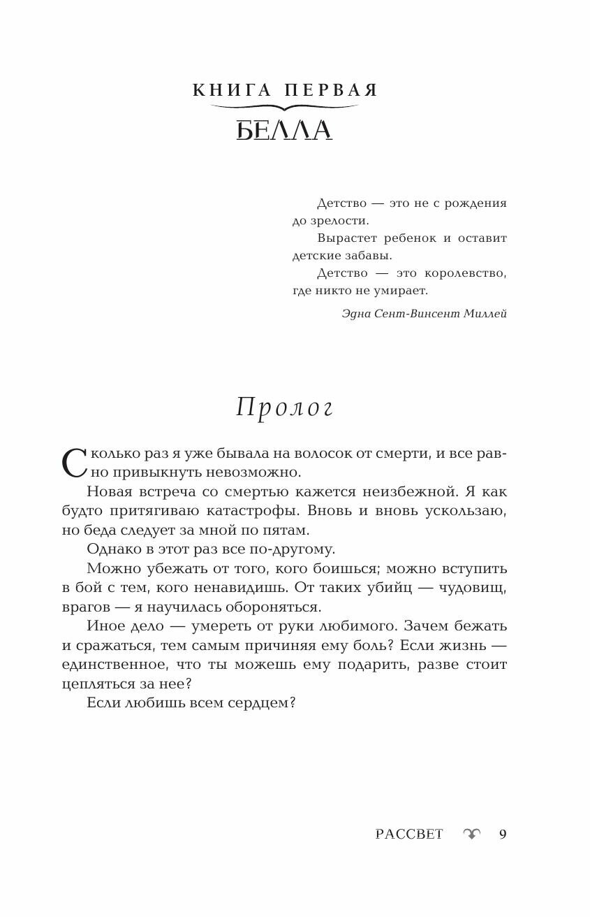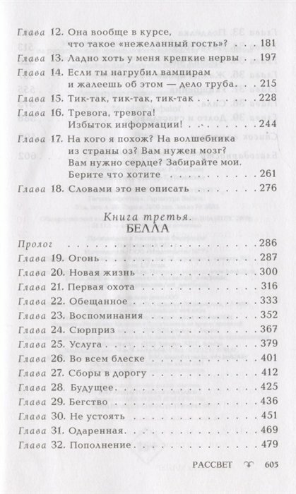 Последняя книга не менее удачная,чем первая(а первая моя самая любимая!).Очень повышен здесь градус напряженности.Читала,не выдыхая.Меня порадовало преображение Беллы не только в плане внешности и «сущности»,но и характер у неё стал сильный,волевой,решительный.Безумно трогательная линия с Ренэсме.Очень приятно было смотреть на таких уже знакомых персонажей с новой стороны.