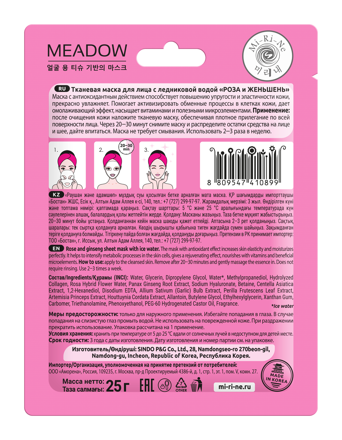 Маска тканевая для лица Mi-Ri-Ne Meadow Роза и Женьшень 25г