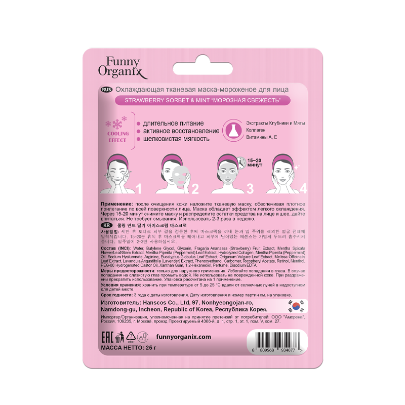 Маска для лица Funny Organix Strawberry Sorbet & Mint Морозная свежесть 22г
