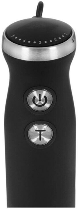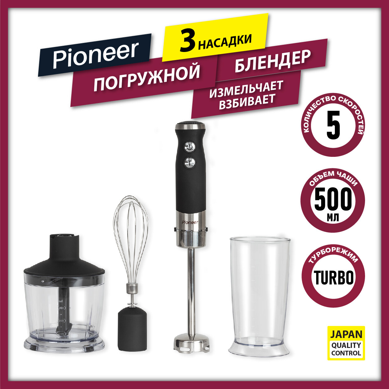 Погружной блендер-измельчитель Pioneer HB121S с покрытием Soft Touch, 3 насадками, 5 скоростями, турбо и импульсным режимами станет ценным помощником на вашей кухне.С нашим блендером Pioneer приготовление супов, вторых блюд, салатов, соусов, выпечки и десертов, зимних заготовок и других ваших любимых блюд станет быстрым и приятным. А особенно блендер является незаменимой вещью для тех, кто вынужден придерживаться диетического питания из-за проблем с ЖКТ, для приготовления детского питания и людей старшего возраста, которым иногда трудно пережевывать жесткую пищу.Наш блендер имеет оптимальную мощность 1200 Вт, что позволяет быстро и качественно использовать прибор, но при этом не переплачивать за электроэнергию.В блендере предусмотрены 5 уровней мощности с плавной регулировкой и импульсный режим работы, который позволяет измельчать особо твердые продукты. Также в модель оборудована ускоренным турбо-режимом.Ножи измельчителя и венчик выполнены из нержавеющей стали, а значит долговечны и безопасны в использовании.Емкость чаши-измельчителя - 500 мл, мерного стакана - 600 мл. Это позволяет вполне комфортно готовить любимые блюда для вашей семьи.Насадки без труда снимаются при помощи нажатия 2-х кнопок.Благодаря специальному прорезиненному покрытию Soft Touch, корпус комфортно лежит в руке, что обеспечивает комфортное использование прибора в течении продолжительного времени. Прорезиненные ножки, установленные на дне чаши измельчителя, не дадут скользить по поверхности стола во время работы.При этом при хранении блендер не занимает много места, что очень важно для небольших кухонь, его можно подвесить на крючок при помощи специальной петли, расположенной на эргономичной ручке.Универсальный черный цвет модели создаст баланс в интерьере любой кухни.Блендер оборудован современным DC двигателем постоянного тока, гораздо менее шумным по сравнению с AC двигателями и более долговечным. Мы обращаем внимание на каждую деталь и стараемся сделать наши приборы максимально удобными.Габариты:- корпус (Д/Ш/В): 18*5*5 см;- венчик: длина 20 см;- насадка-измельчитель: длина 19 см;- чаша-измельчитель (Д/Ш/В): 19*13*13 см;- мерный стакан (Д/Ш/В): 17,5*9*9 см.Длина шнура 1,35 м.Комплектация: блендер, съемная насадка-венчик, мини-измельчитель, мерный стакан, руководство по эксплуатации, гарантийный талон.Надежный, стильный и качественный блендер Pioneer станет незаменимым помощником на вашей кухне.