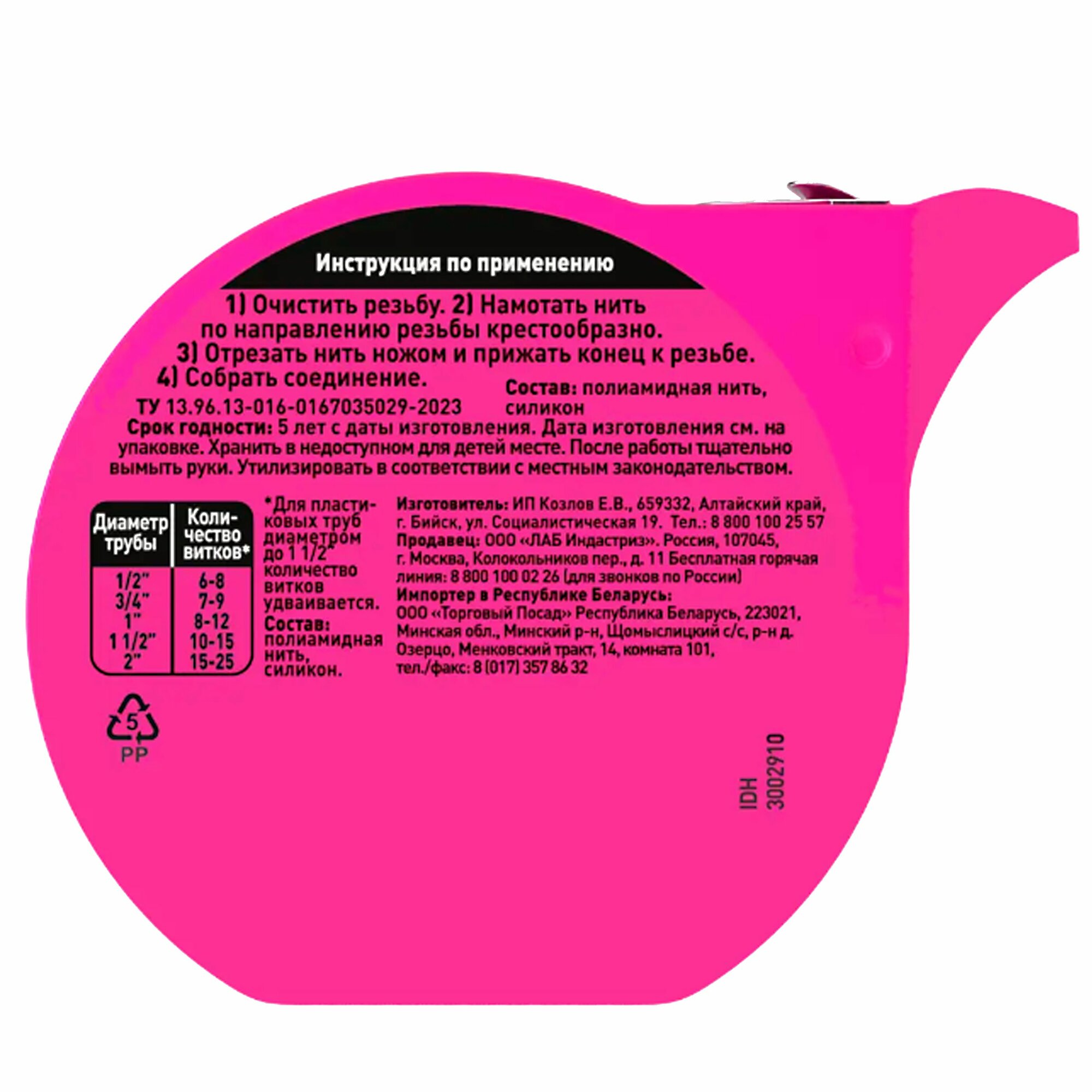 Ленту наматывают на резьбу в направлении витков резьбы, начиная с конца трубы. Канавки резьбы следует обработать с помощью напильника, а затем обмотать резьбу, не обязательно попадая в канавки. Ленту можно отрезать с помощью режущей кромки, которая имеется на крышке контейнера. Лента намотана в контейнере спирально и будет разматываться без усилий. Убедитесь, что продукт накладывается с некоторым натяжением.