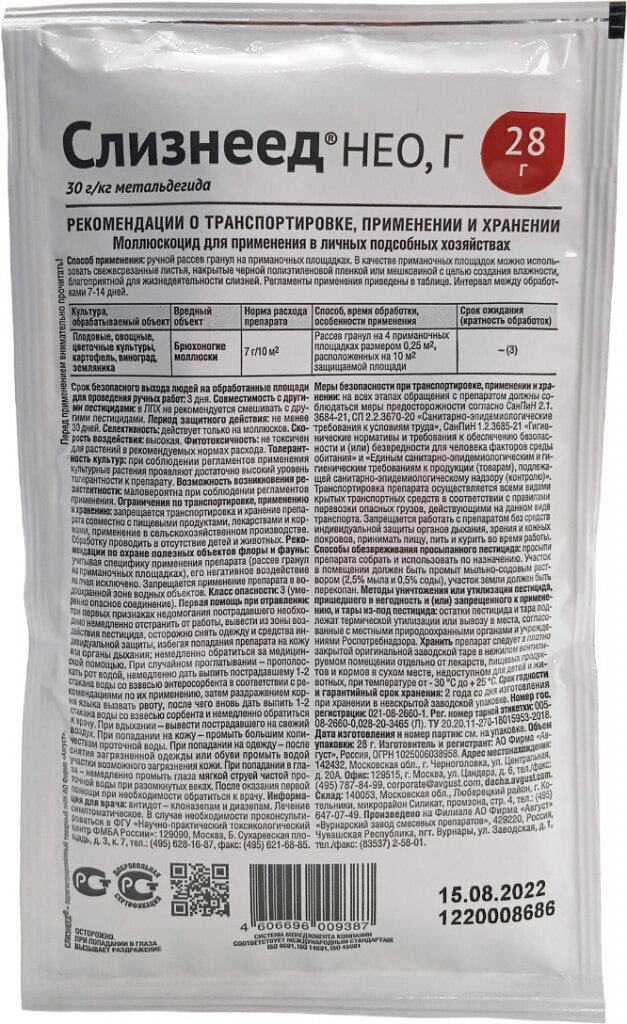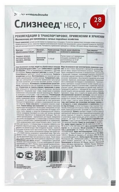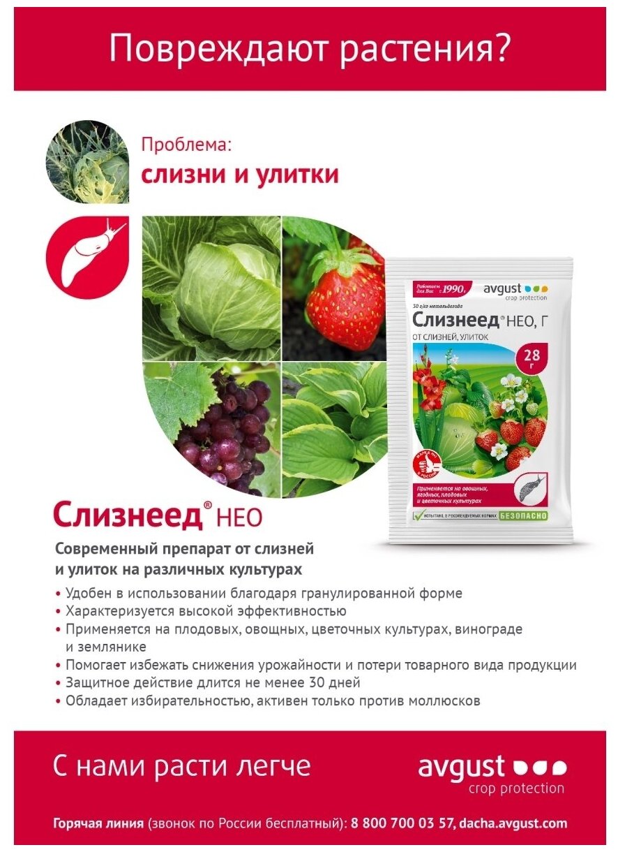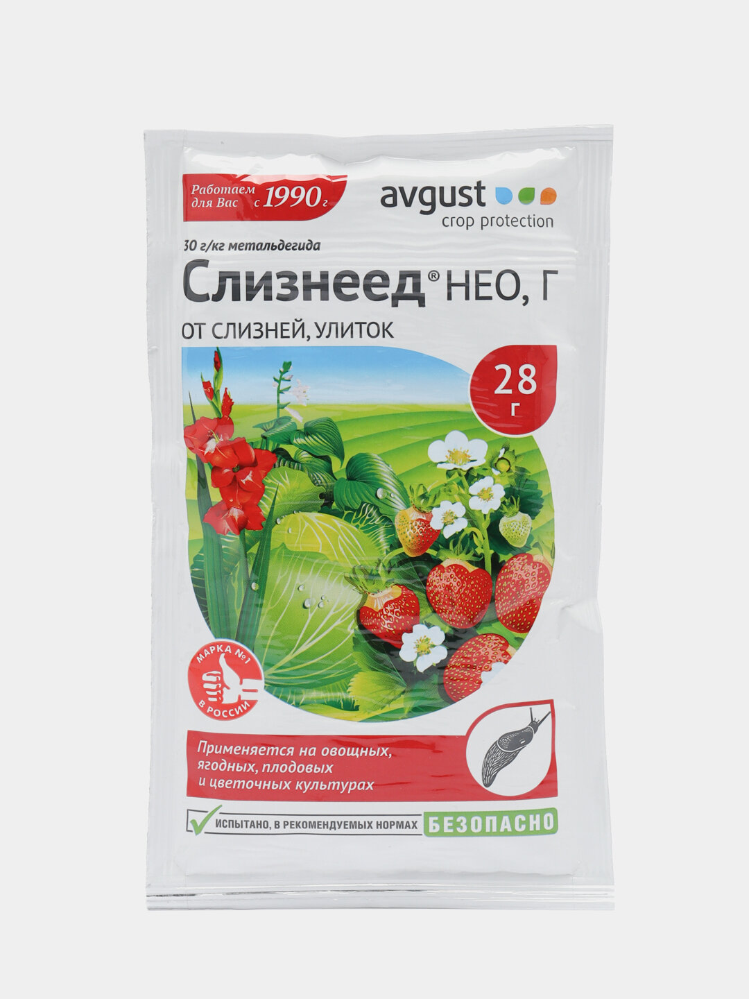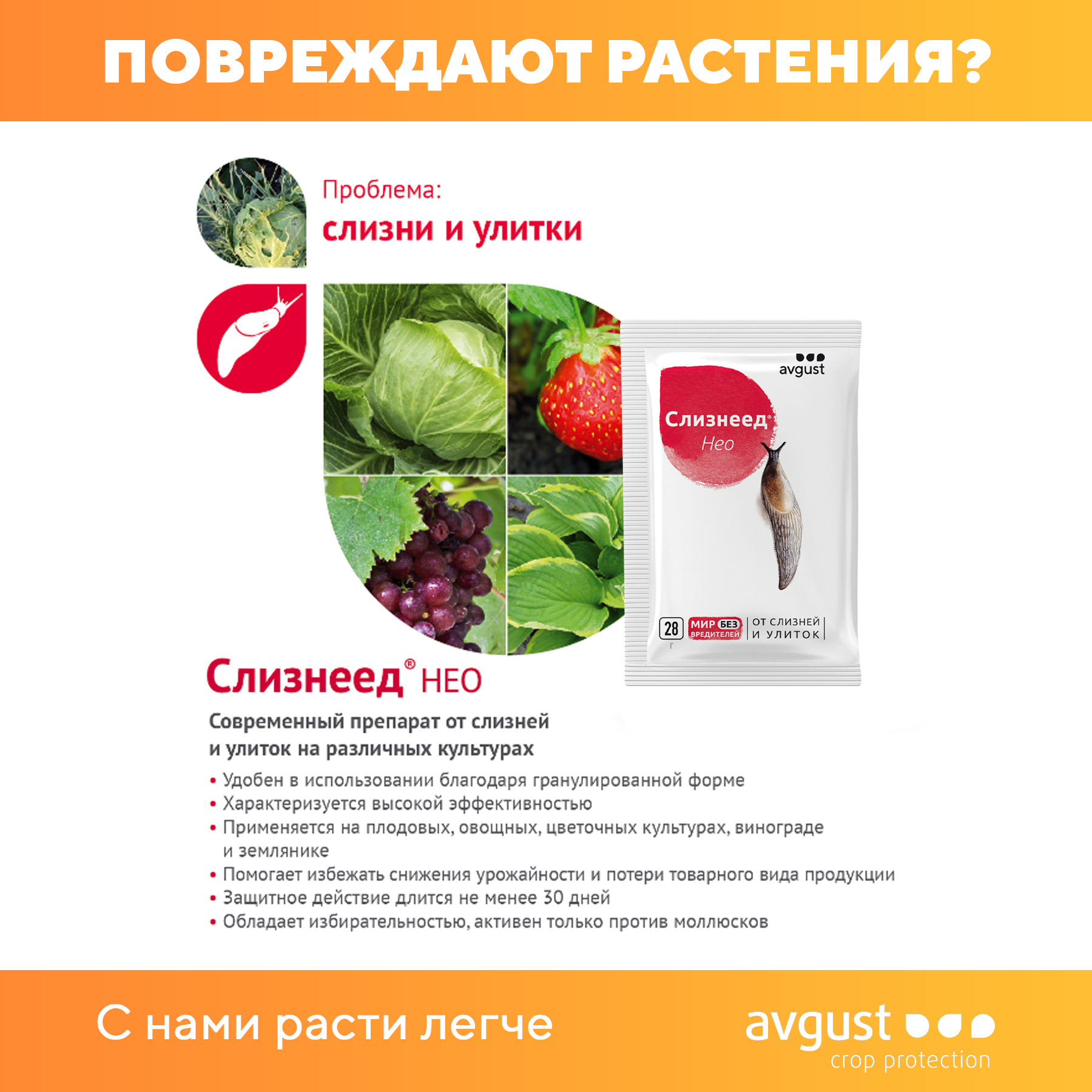 **Средство от слизней «Август Слизнеед Нео»** — готовая гранулированная приманка для уничтожения брюхоногих моллюсков на овощных и плодовых растениях. Эффективно справляется с улитками на винограде, картофеле, землянике. Для достижения максимального эффекта необходимо соблюдать норму расхода препарата, рекомендованную производителем.