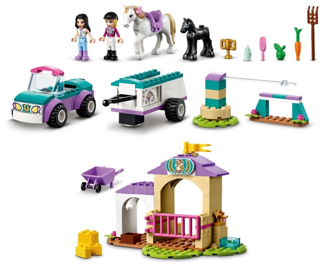 - Набор включает в себя автомобиль, на котором могут ездить подружки LEGO® Friends, прицеп для лошади, конюшню с набором для ухода за лошадьми, вольеры и тренировочную узду, с которой дети могут научить лошадь ходить вокруг площадки.