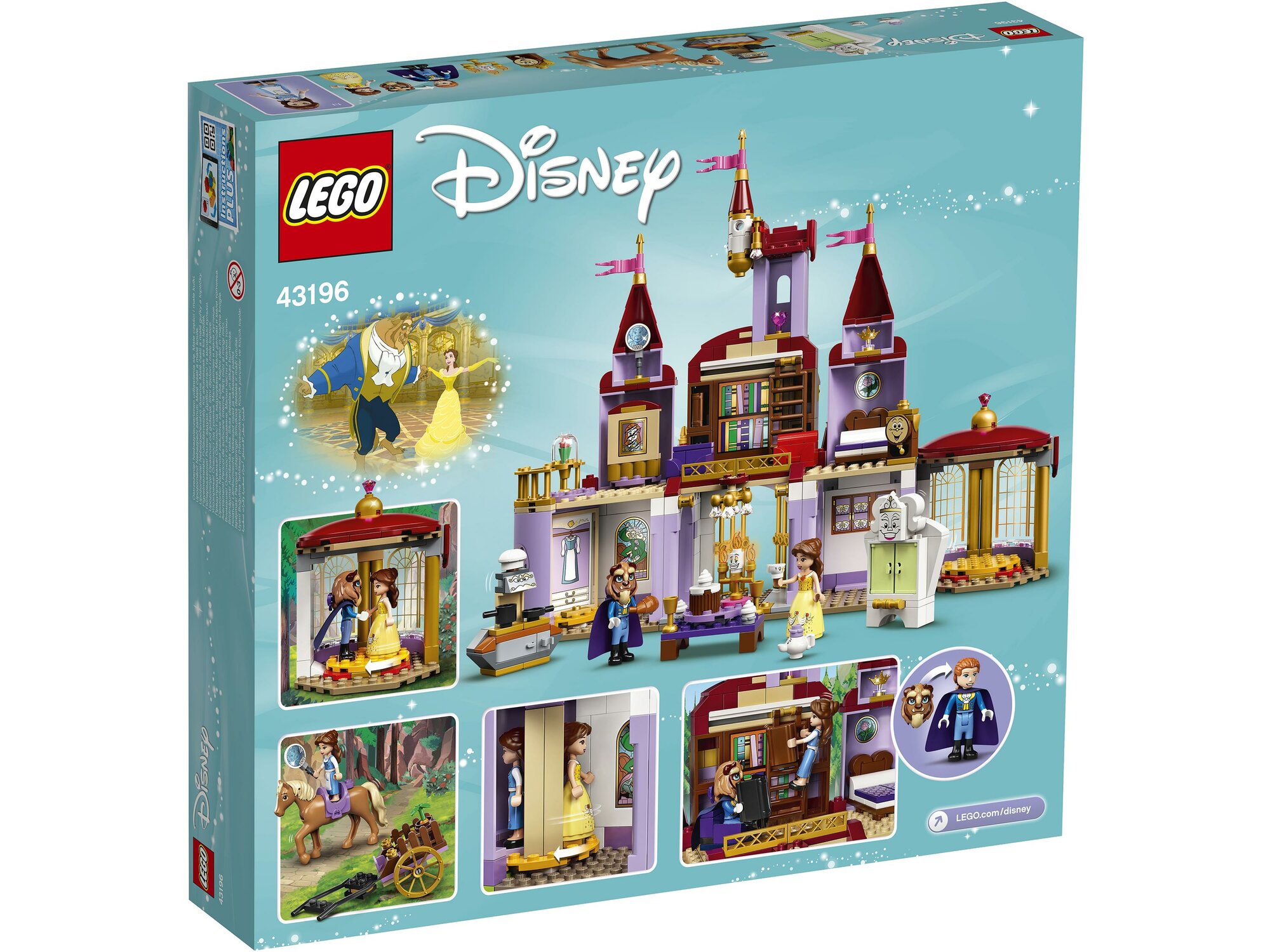 - Соберите двухэтажный замок с вращающимся танцполом, вращающимся шкафом, тремя мини-куколками (включая 2 версии Белль и принца с головой Чудовища), конем Филиппом и шестью другими фигурками LEGO®.