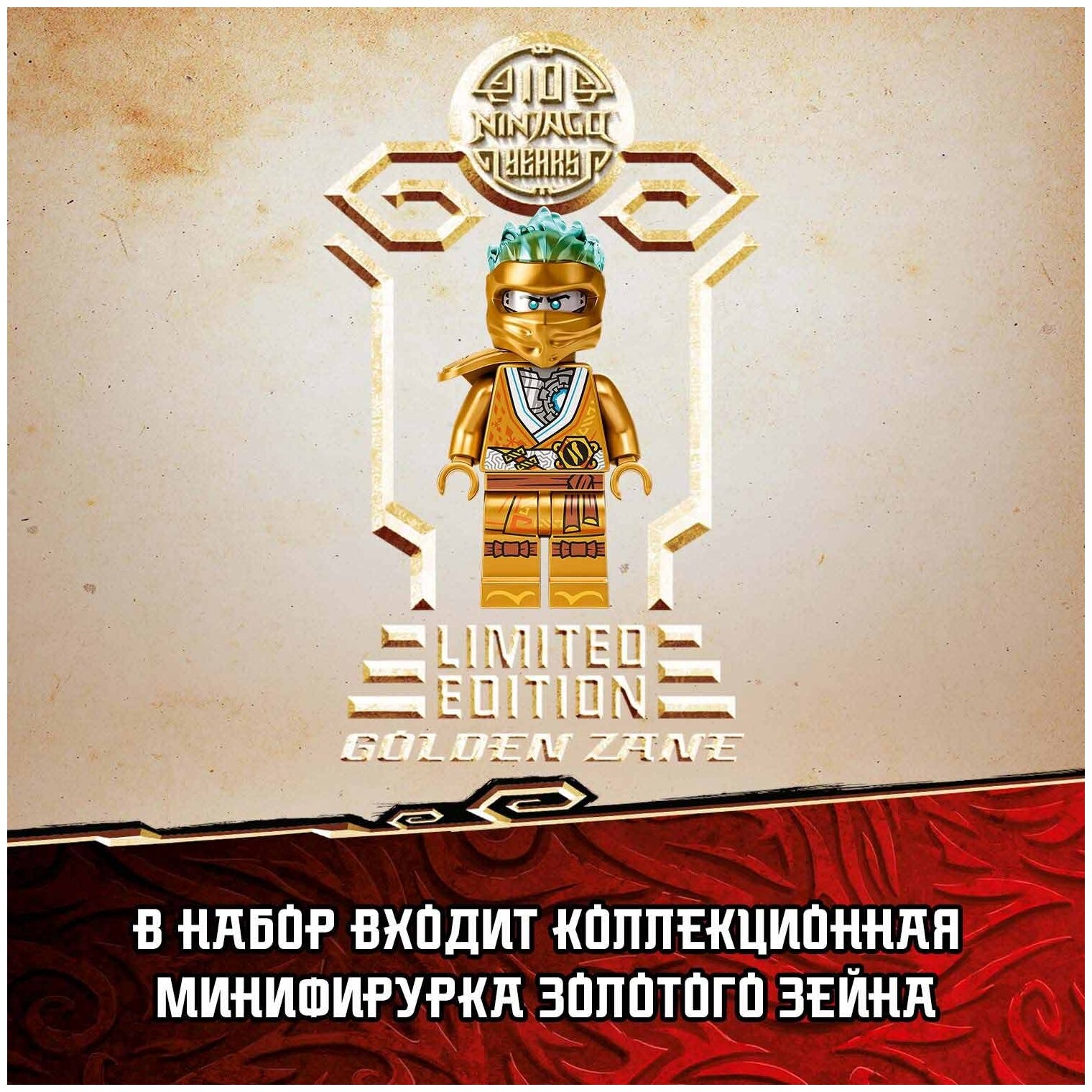 - Включает коллекционную золотую минифигурку «Наследие Зейна» на небольшой подставке в честь десятилетнего юбилея игрушек NINJAGO®.