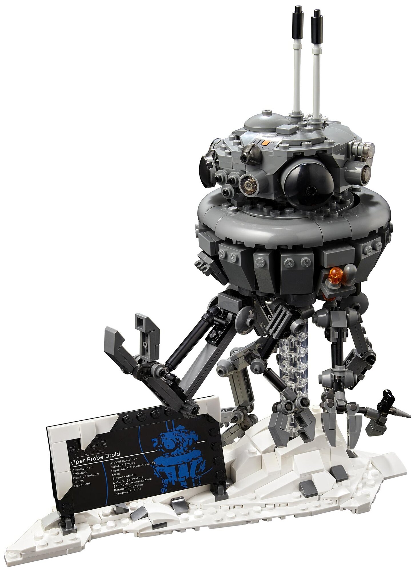 Коллекционная модель Императорского разведывательного дроида стального цвета с отличной детализацией с подвижными ногами и прозрачным стержнем из кубиков, чтобы подвесить его над снежной сценой планеты Хот. В комплекте информационная табличка. Размер модели 27х24х11 см.