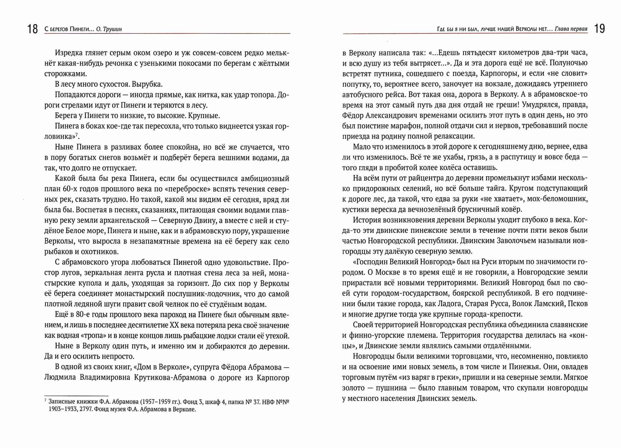 В первой книге трилогии — «С берегов Пинеги…», — вобравшей в себя периоды жизни писателя с 1920 по 1952 гг., рассказывается об истории родной деревни Фёдора Абрамова — Верколы, о детских, школьных и студенческих годах будущего писателя, о его работе в Ленинградском университете, участии в Великой отечественной войне и службе в Смерш. Книга адресована массовому читателю.