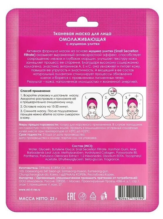 Маска тканевая для лица Mi-Ri-Ne Snail Mucin омолаживающая с муцином улитки 23г