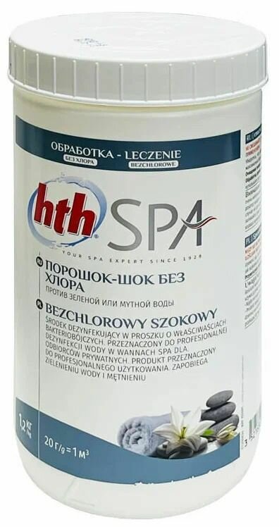 Порошок-шок без хлора HTH SPA(D800220HP) - препарат для шоковой обработки воды СПА бассейна от всех микроорганизмов. Эффективная очистка зеленой и мутной воды в гидромассажном СПА бассейне. Предназначен для высокой температуры. Полное растворение без осадка. Особенности препарата Порошок-Шок HTH SPA: • Порошок-шок HTH SPA полностью без хлора. • Очень быстро эффективен против зеленой или мутной воды. • Дезинфицирующее средство (порошок) на основе активного кислорода. • Совместим со всеми типами фильтров. • Подходит для любой воды, даже очень жесткой. • Эффективен при любом рН обработанной воды. • Высокое содержание активного вещества, не содержит изоциануровых кислот (стабилизаторов). Расход препарата Порошок-Шок HTH SPA: Препарат используют из расчета 20 грамм на 1 куб. м воды. Рекомендации по применению: • Добавление по возможности вечером после купания. • Поддерживайте рН от 7,0 до 7,6. Для этого используйте средства pH минус и pH плюс. • Включите систему фильтрации и поместите гранулы хлора в скиммер, дозирующий поплавок или в емкость фильтра. 1. Шоковая обработка: Если вода приобретает зеленоватый оттенок или становится мутной, то следует засыпать прямо в чашу при включенной фильтрации, из расчета 20 грамм на 1м. куб (1000 л) воды. 2. Реактивация брома: Каждые 15 дней при включенной фильтрации засыпать прямо в чашу, из расчета 15 грамм на 1м. куб (1000 л) воды.