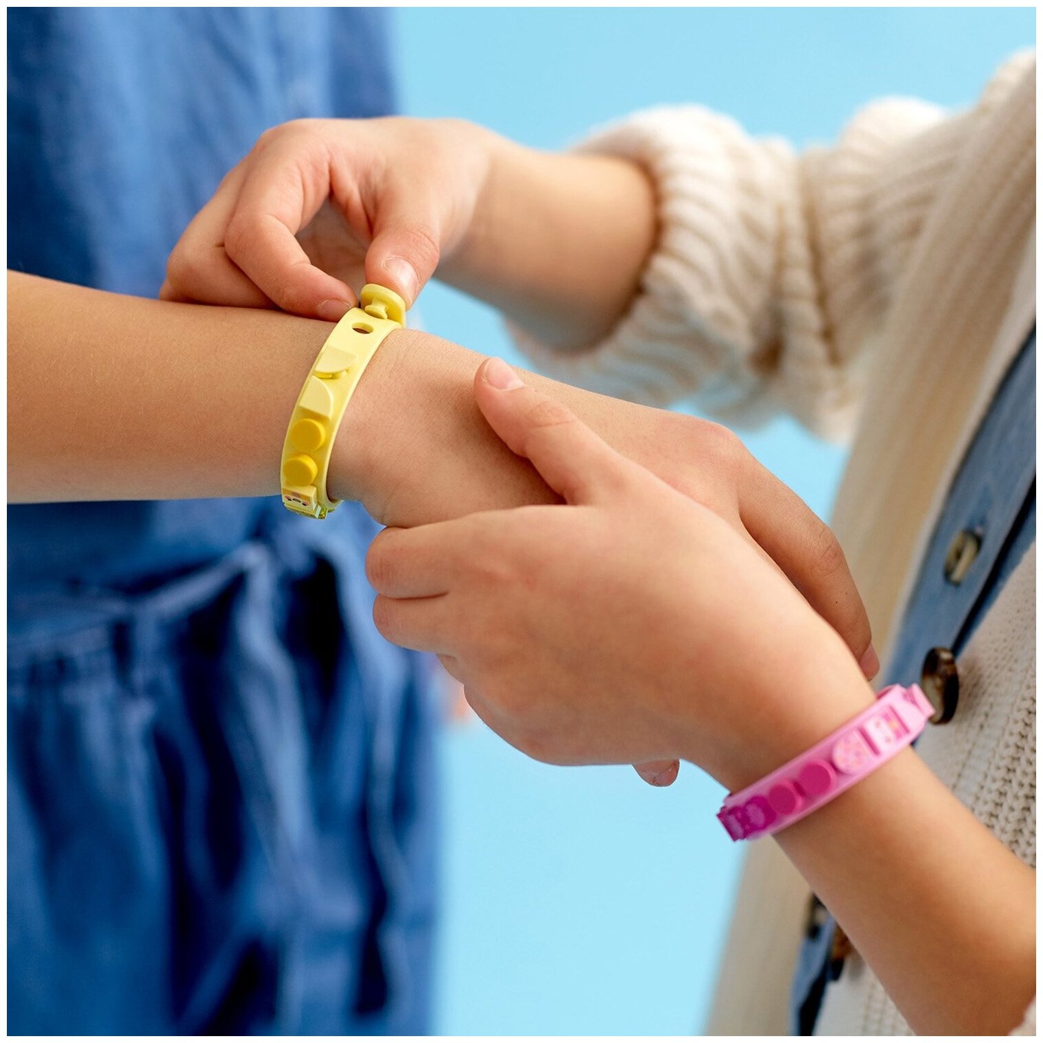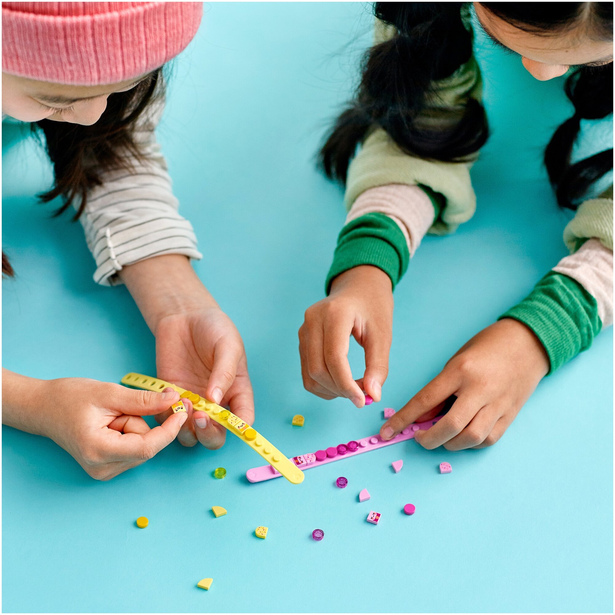 В этот набор входят два регулируемых однорядных браслета пастельных жёлтого и розового цветов, которые удобно носить на больших и маленьких запястьях. Он также включает в себя 32 разноцветные плитки для украшения, в том числе очаровательные розовые плитки с блёстками и крутые детальки с изображением мороженого. Мальчики и девочки могут воспользоваться входящими в набор идеями для вдохновения или придумать собственные уникальные украшения для браслетов.