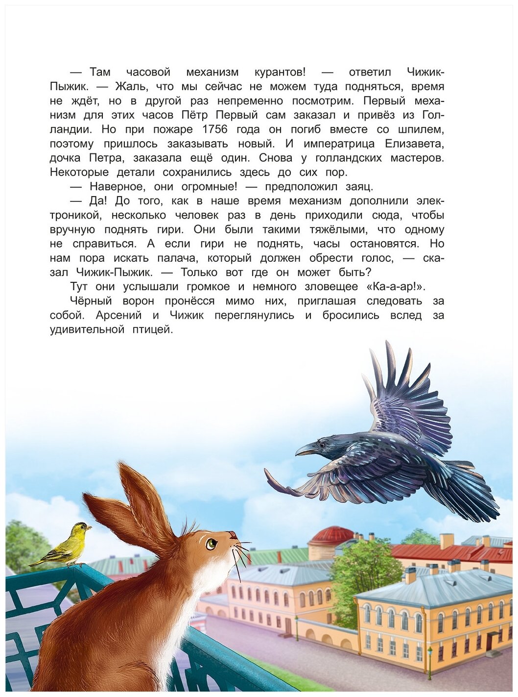 Чижику-Пыжику предстоит новое увлекательное приключение, да не где-нибудь, а в самом сердце Санкт-Петербурга. Спутником его станет Арсений — зайчик, спасшийся от наводнения, что сидит на свае у Иоанновского моста. Друзьям предстоит разгадать загадку старинного манускрипта и заглянуть в самые таинственные уголки Петропавловской крепости. Почему остров называется Заячьим? Зачем кораблю дом? Кто подвесил короля вверх ногами? Как звучит музыка колоколов? Угрожают ли наводнения городу на Неве? Что такое тюремная азбука и куда ведёт тайный ход в крепостной стене? Ответы на эти и многие другие вопросы ты найдёшь, если отправишься в новое путешествие с Чижиком-Пыжиком.