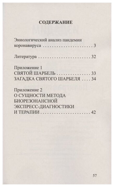С помощью уникального биолокационного метода экспресс-диагностики и терапии проведено эниологическое исследование источника и причин появления на земле коронавируса Covid-19, механизма заражения им человека и предложены методики его нейтрализации (йоговское очистительное дыхание, активация чакр, медитация, ментально-напрягательные упражнения, рациональное питание и др.), а также метод высокочастотной компьютерной коррекции с использованием в качестве "активаторов" целительных программ фотографии позитивной плащаницы Иисуса Христа, посмертной фотографии Святого Шарбеля, трелей соловья, колокольного звона, высокочастотной гармоничной музыки композиторов-индиго.