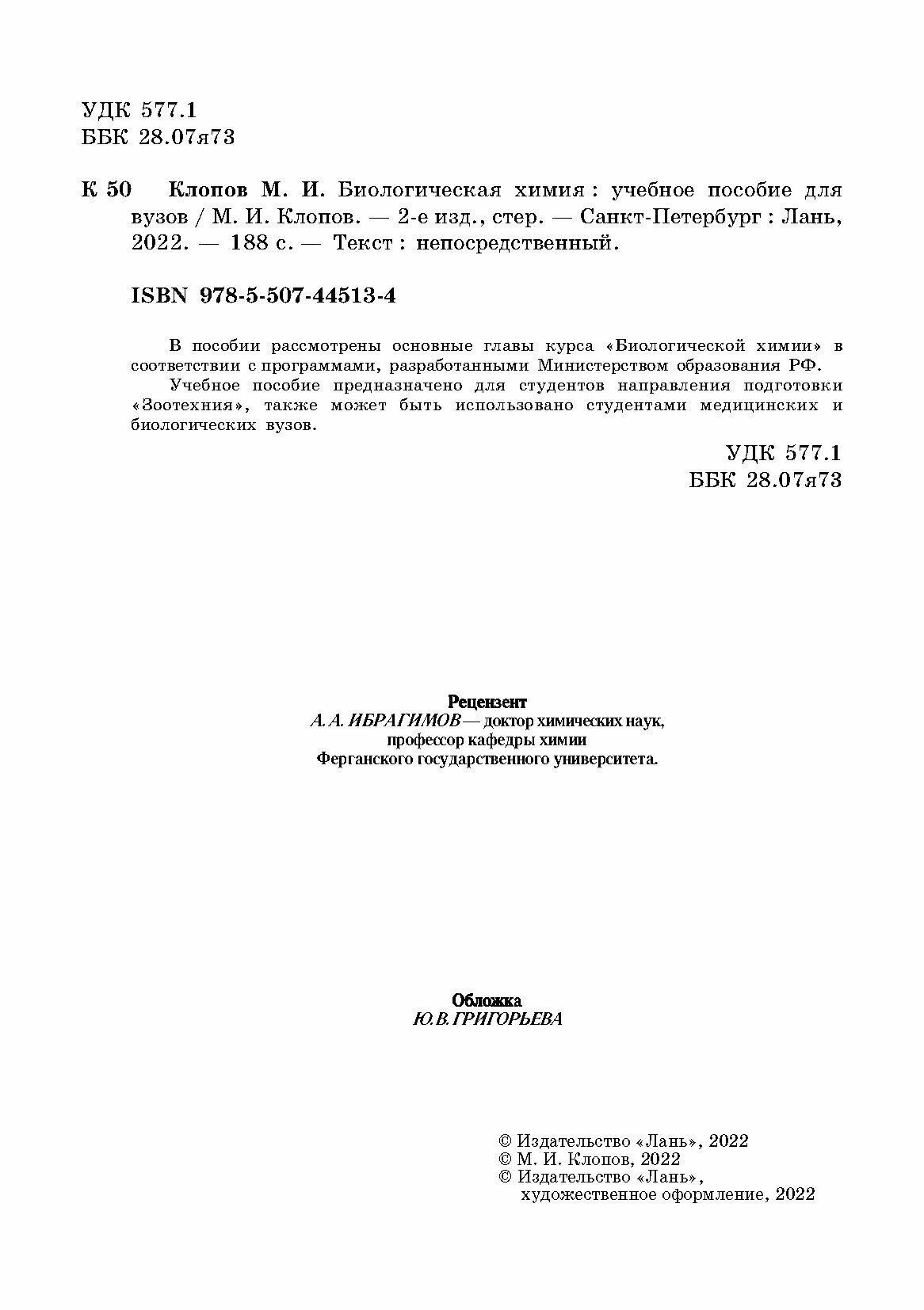 Книга: Биологическая химия (М. И. Клопов); Издательство ЛАНЬ, 2022