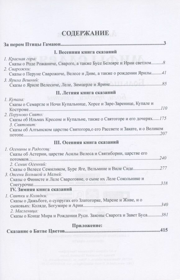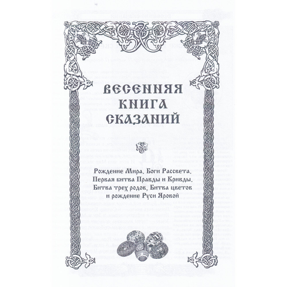 Эта книга сказаний о Сотворении Мира, о древних богах и героях славян, об Алтынской и Борейской эпохах (о временах Атлантиды и Гипербореи), а также о Конце и новом Возрождении мира, а также о Рождении Руси. Все сказания сопровождаются толкованиями и пояснениями календарными. В приложении даётся воссозданное сказание из "Хроник Святояров" о Битве цветов у озера Светлояр.