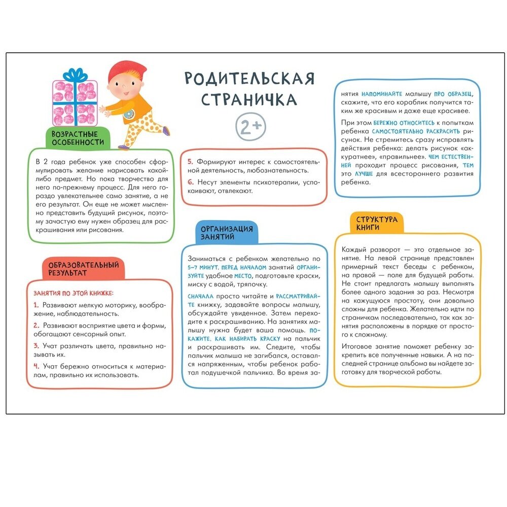Книга «Рисуем красками 2+» из серии «Школа Семи Гномов. Мастерская» — это альбом для занятий рисованием с ребенком от 2 до 3 лет. Занятия на близкие и понятные ребенку темы расположены по мере усложнения: поступательно переходя от освоения простых навыков к более сложным заданиям, ребенок научится рисовать с помощью пальчиков и создавать красочные рисунки.