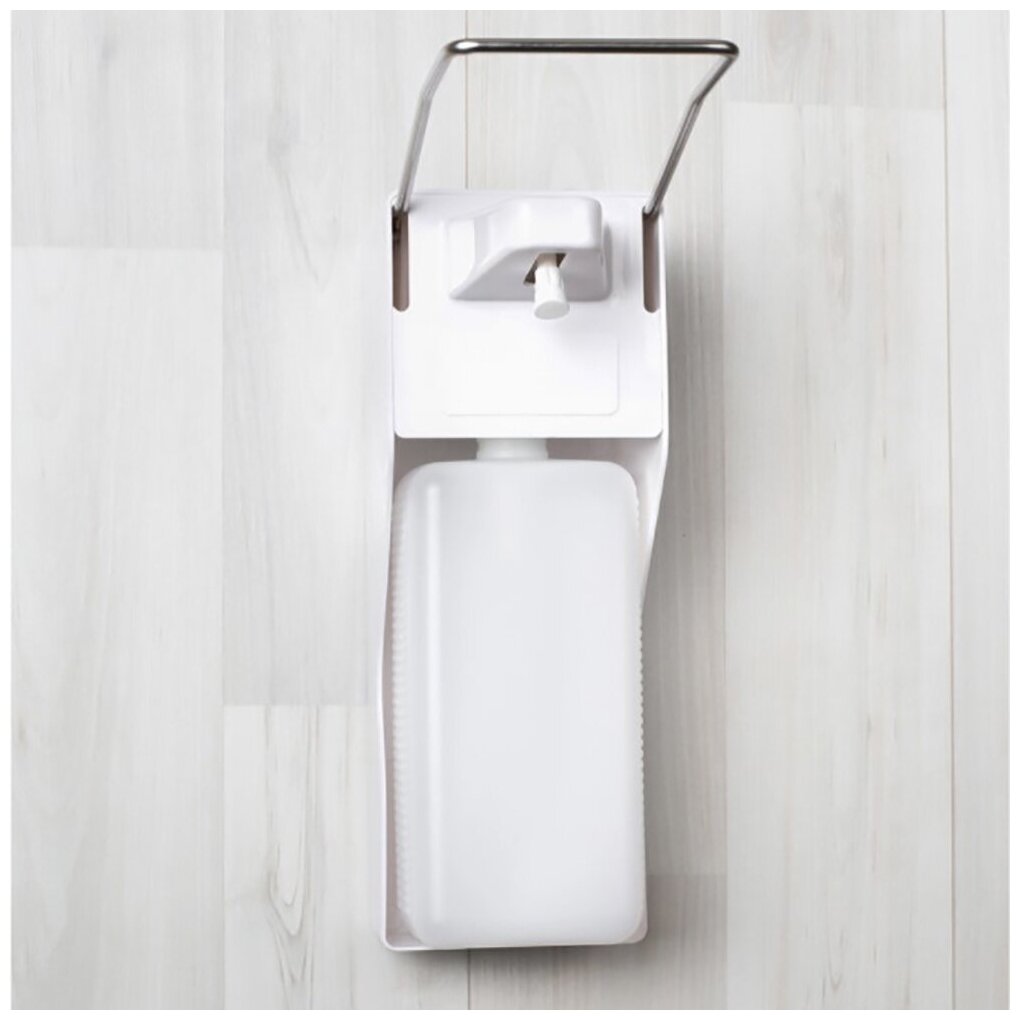 Локтевой дозатор для антисептика и жидкого мыла для настенного крепления.Предназначен для оснащения санитарно-гигиенических комнат сетей общественного питания, спортивных, медицинских заведений, баров, ресторанов, кафе, школ, а также для использования в домашних условиях. Отсутствие прямого контакта ладони с дозатором. Подача жидкости осуществляется легким нажимом локтя на рычаг. Материал: корпус (ударопрочный пластик), рычаг (металл - нержавеющая сталь). Габаритные размеры: В 29 х Ш 10 х Г 23,5 см (с рычагом). Привод устройства - локтевой. Режим работы - многократный, циклический. Максимальное усилие на рычаге - 3,5 кг. Имеет съемный контейнер (флакон) для моющего средства. Объём флакона: 1000 мл. Объём выдаваемой жидкости: 1,5 мл. Благодаря специальной распылительной насадке с 3-мя отверстиями в форме правильного треугольника каждая порция средства равномерно распределяется по всей ширине ладони 3-мя потоками (струйками).