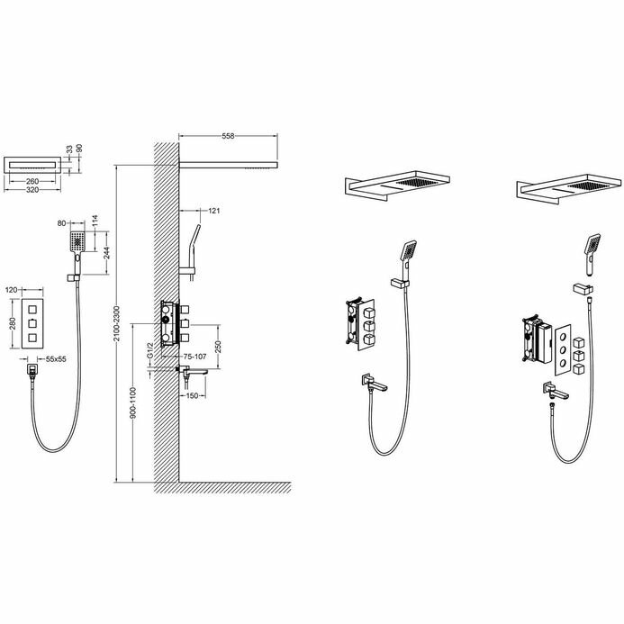 | Оснащение | Душевая лейка / Шланг для душа / Держатель душа / Шланговое подключение / Излив / Скрытая монтажная часть |