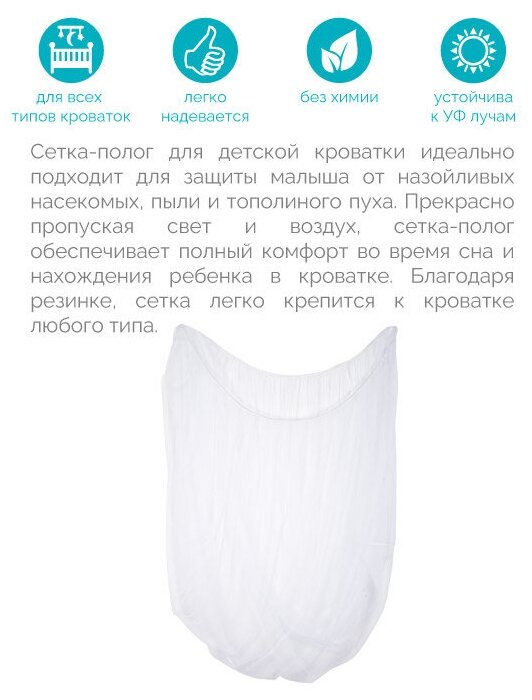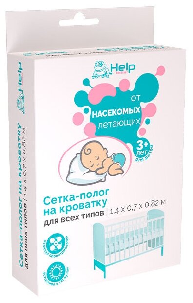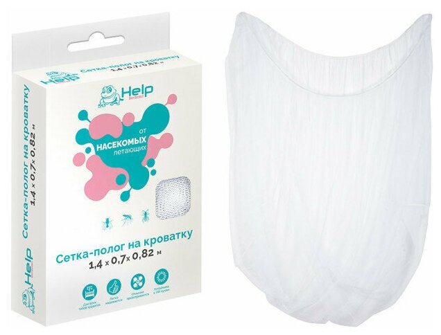 Москитная сетка на кроватку Help подходит для защиты малыша от мошек, комаров и других назойливых насекомых с момента рождения. Прекрасно пропуская свет и воздух, сетка-полог обеспечивает полный комфорт во время сна и нахождения ребенка в кроватке.