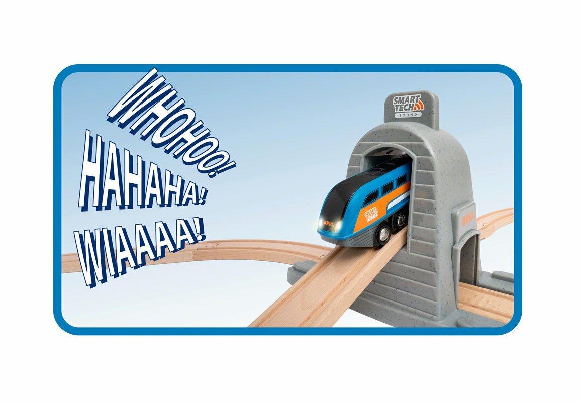 Большой Smart Tech набор с возможностью записи звука. Запись голоса можно сделать нажав кнопку на самом поезде или через Bluetooth. Когда поезд пройдет через оранжевый тоннель, твой звук воспроизведётся. Всем тоннелям набора можно задать свой звук, что сделает игру еще увлекательнее! Откройте все возможности набора BRIO Smart Tech Sound играя со звуками, светом и движением поездов! Работающий на батарейках поезд является центральным элементом и может взаимодействовать с окружением, автоматически реагируя на интеллектуальные технические аксессуары различными действиями.