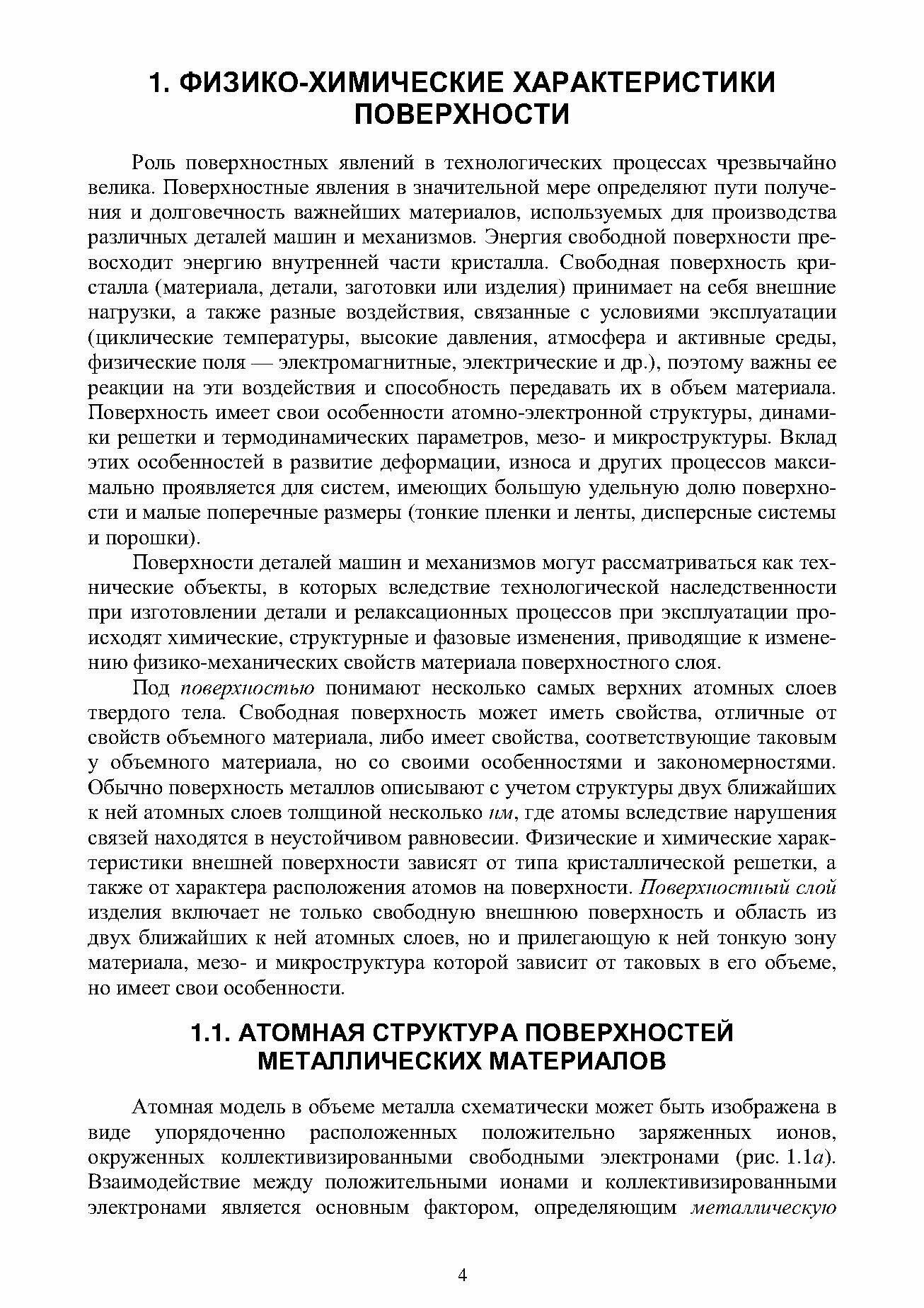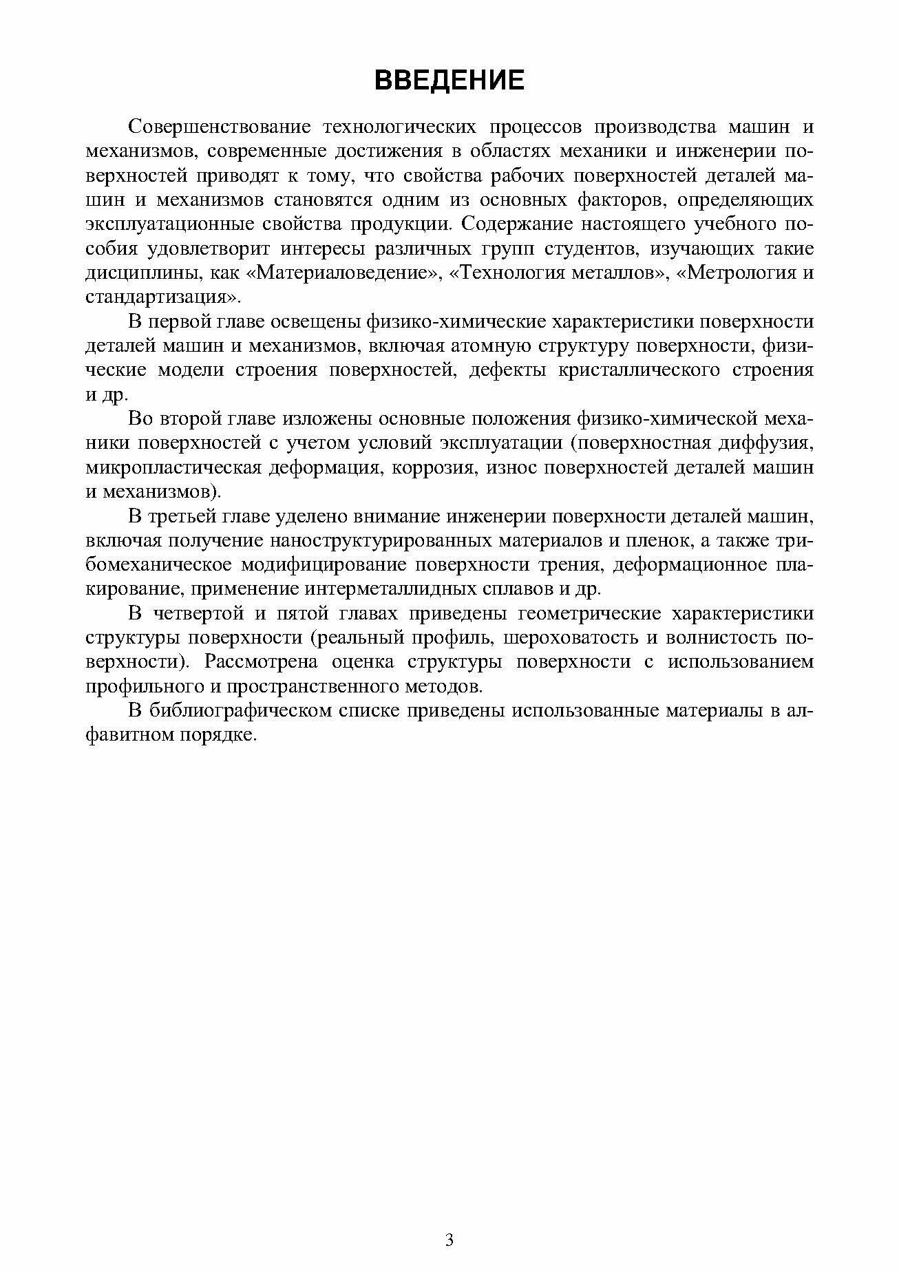 В пособии комплексно отражены вопросы рассмотрения поверхности изделий, обладающих сложным набором характеристик от физико химических до геометрических микро и нанометрического масштаба. Излагаются современные представления о физико химических характеристиках поверхности, физико химической механике поверхностей деталей машин и механизмов с учетом условий их эксплуатации. Рассматриваются технологические методы инженерии поверхностей, связанные с изменением структуры поверхностного слоя. Геометрические характеристики структуры поверхности (первичный профиль, шероховатость и волнистость поверхности) изложены в соответствии с последними нормативными документами.