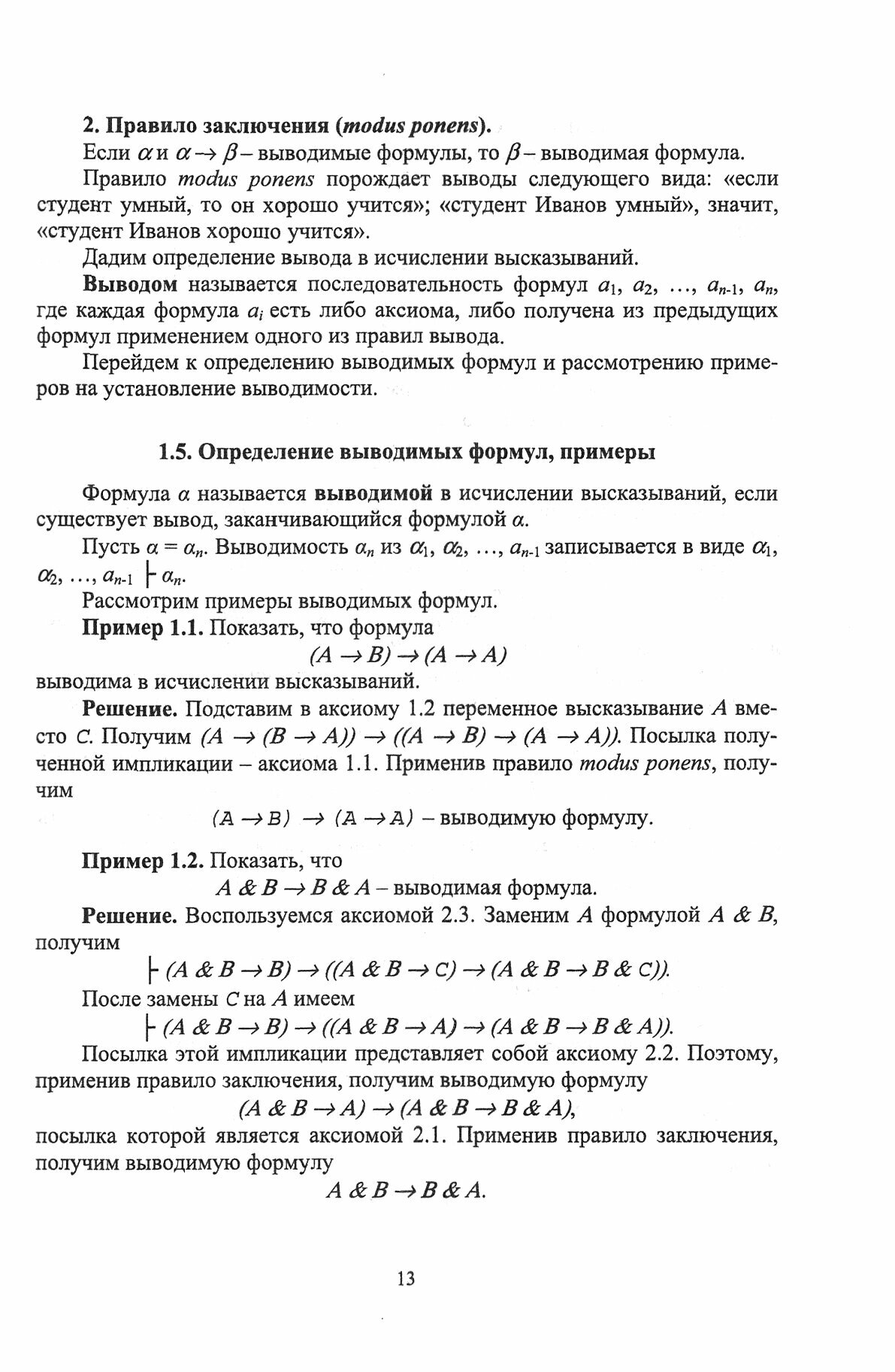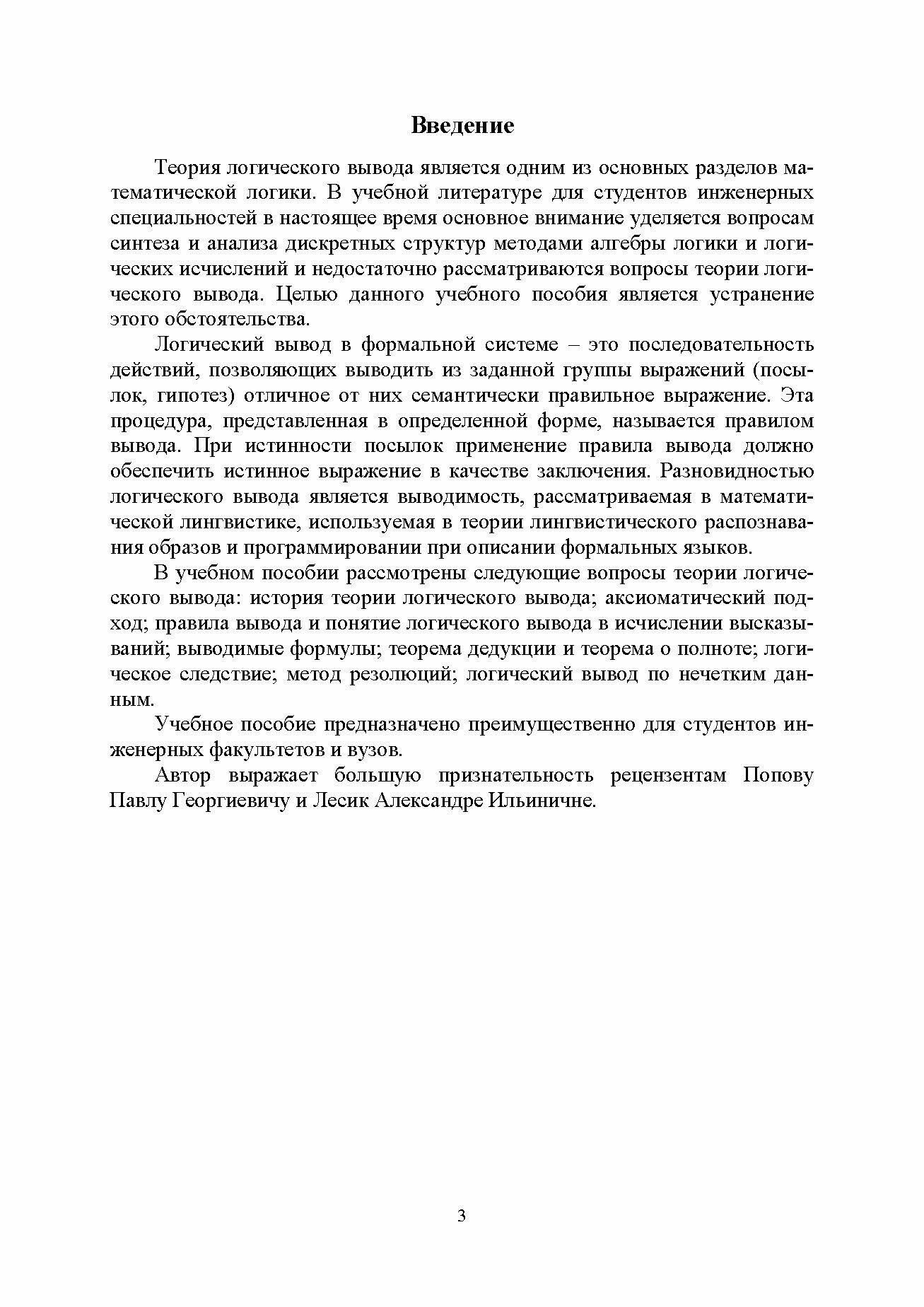 Рассмотрены вопросы теории логического вывода: история теории логического вывода, аксиоматический метод Д. Гильберта, выводимость в исчислении высказываний, метод резолюций, логический вывод по нечетким данным.