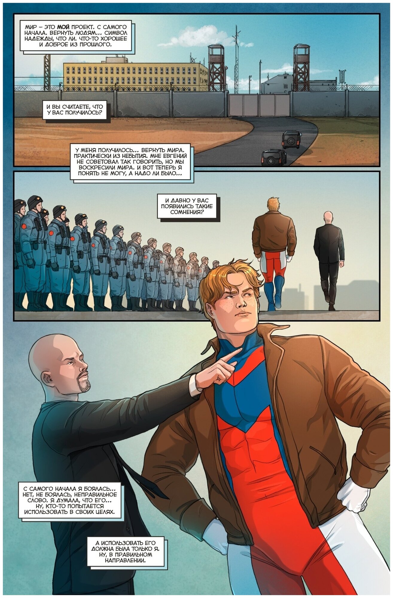 Очередной том о приключениях советского супергероя Мира и Саши Македонской - девушки, которая и вернула Мира из небытия - остается верен себе. Здесь и очередные приключения, и очередной стилизованный комикс-в-комиксе, помогающий героям разобраться с очередным противником. Тем не менее (хотя нам и не показывают основного антагониста, который появился в конце третьего тома), комикс становится все напряженнее и интереснее. Из плюсов - то, что заканчивается на интригующей ноте, из вроде бы минусов - небольшой объем (всего два выпуска), что заставляет ждать продолжения.