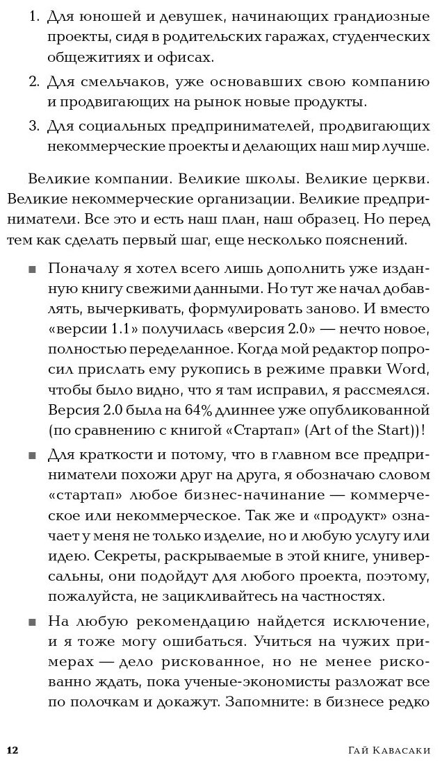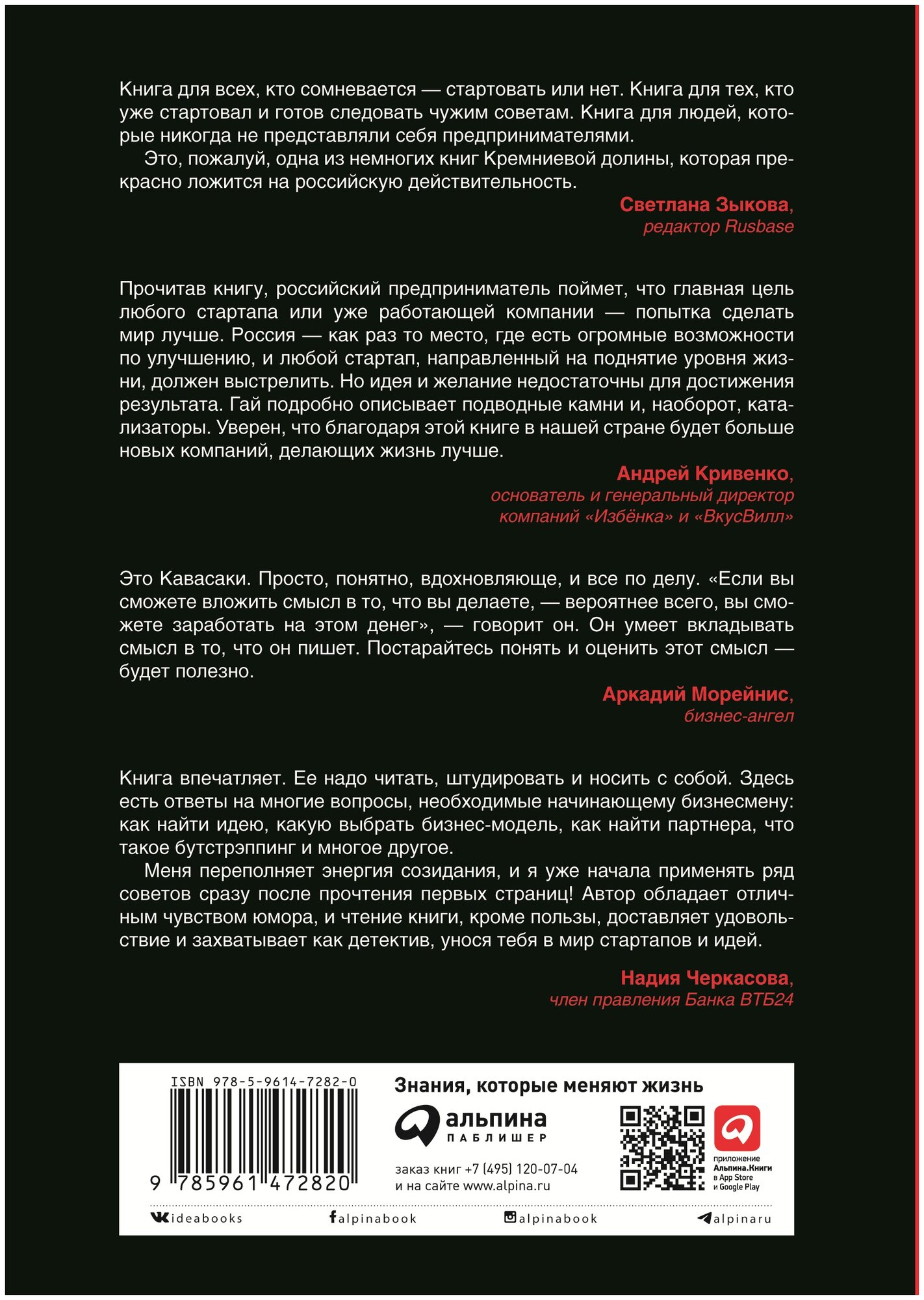 Когда Кавасаки пишет инструкцию по созданию успешного стартапа, он знает, о чем пишет. Нет смысла в советах «как не допустить распространенные ошибки» — вы все равно их допустите. Гораздо интереснее, как удержаться на плаву и начать наконец расти после того, как вы ошиблись. Ответ есть в этой книге. Кавасаки любит повторять, что предприниматель — это не работа, а состояние ума. Настроиться на такое состояние помогает эта книга.