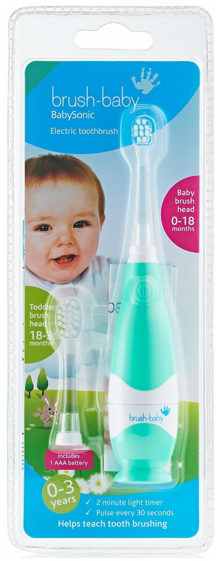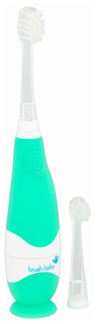 Детская электрическая звуковая зубная щётка Brush-Baby BabySonic бирюзового цвета разработана для чистки первых молочных зубов для возраста с 0 до 36 месяцев. Прибор комплектуется двумя разными насадками: с маленькой головкой предназначена к использованию от 0 до 1,5 годиков, изогнутая побольше, идеально подойдёт от 1,5 до 3 лет.Щётка Браш Бэйби имеет световой таймер и автоматически отключается после двух минут работы. Также она сигнализирует вибрацией о необходимости сменить зону чистки каждые 30 секунд.Прибор оснащён эффективным звуковым мотором, обеспечивающим 16000 колебаний щетинок в минуту. Эта частота оптимально подобрана для детей до 3 лет. Baby Sonic имеет удобную толстую прорезиненную ручку, которая позволит без труда почистить труднодоступные области во рту малыша.Изделие работает от одной батарейки AAA (мизинчиковая, идёт в комплекте).Для достижения наилучших результатов рекомендуется использовать с детской пастой Brush-Baby Teethening для прорезывающихся зубов или Applemint.
